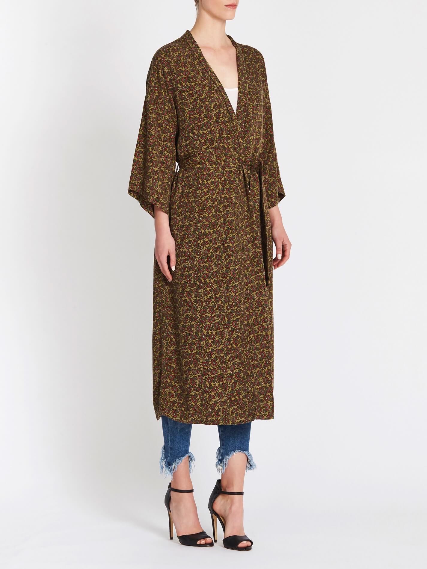 Pretty in paisley, the long Cashmere coloured Janebay Coat by American Vintage. This loose bohemian style features flowy three quarter length sleeves and a fabric belt. Perfect for throwing over a chic chemise or grunge it up with a silken cami and some well loved leather pants.