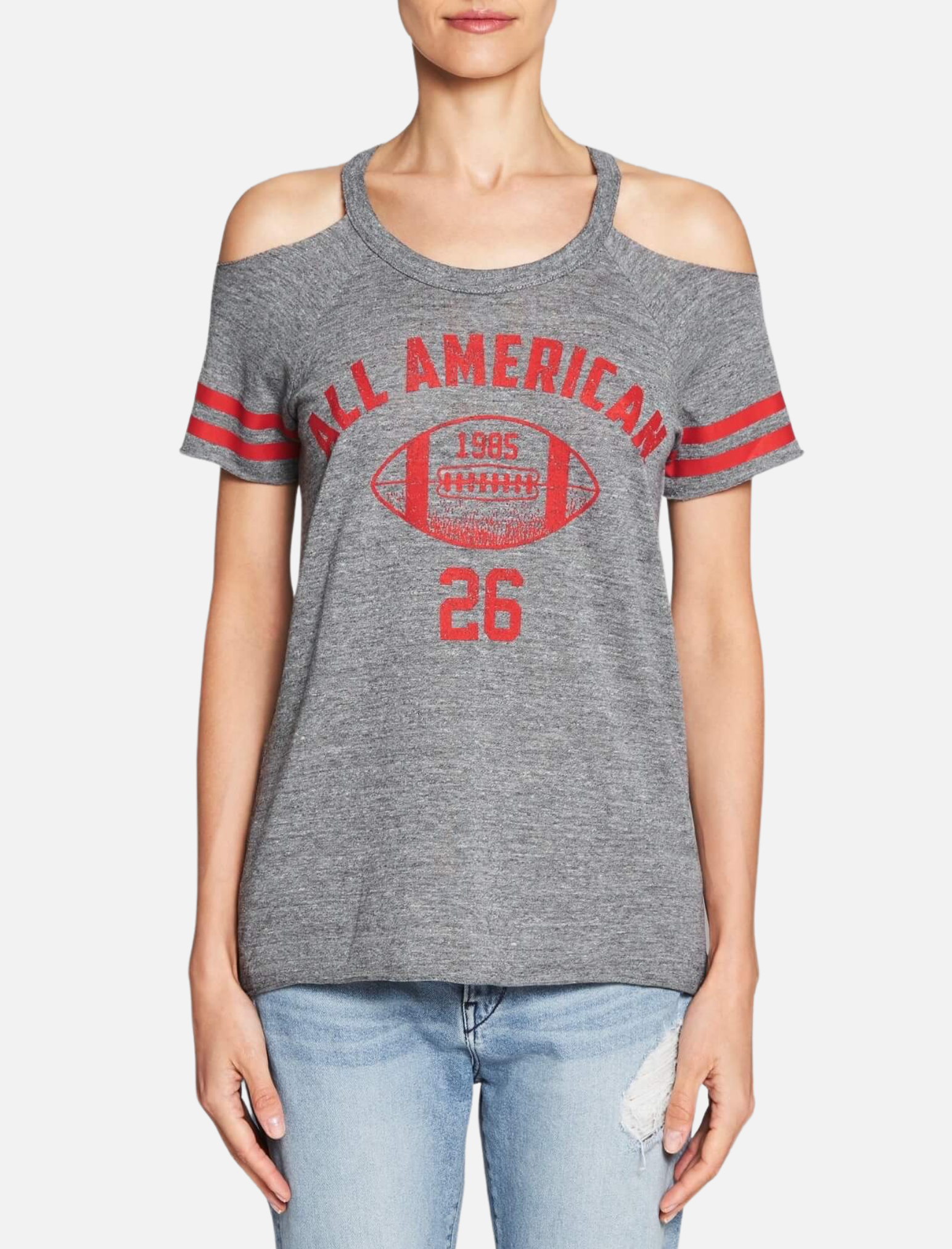 The Chaser All American Cold Shoulder Raglan Tee in Streaky Grey is true to size