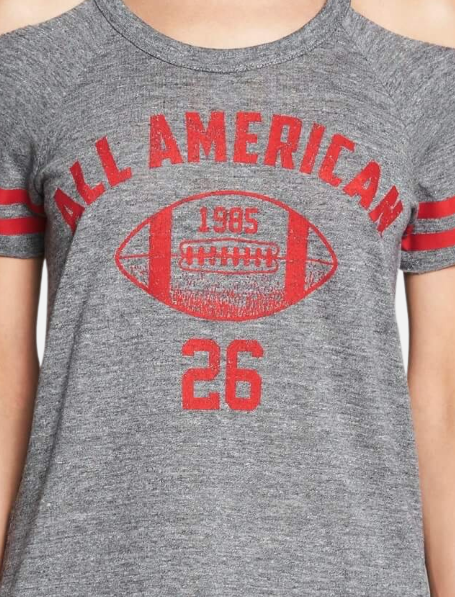 The Chaser All American Raglan short sleeved Tee is a heather grey top with a patriotic red graphic print, a round neck and cold shoulder cut outs.