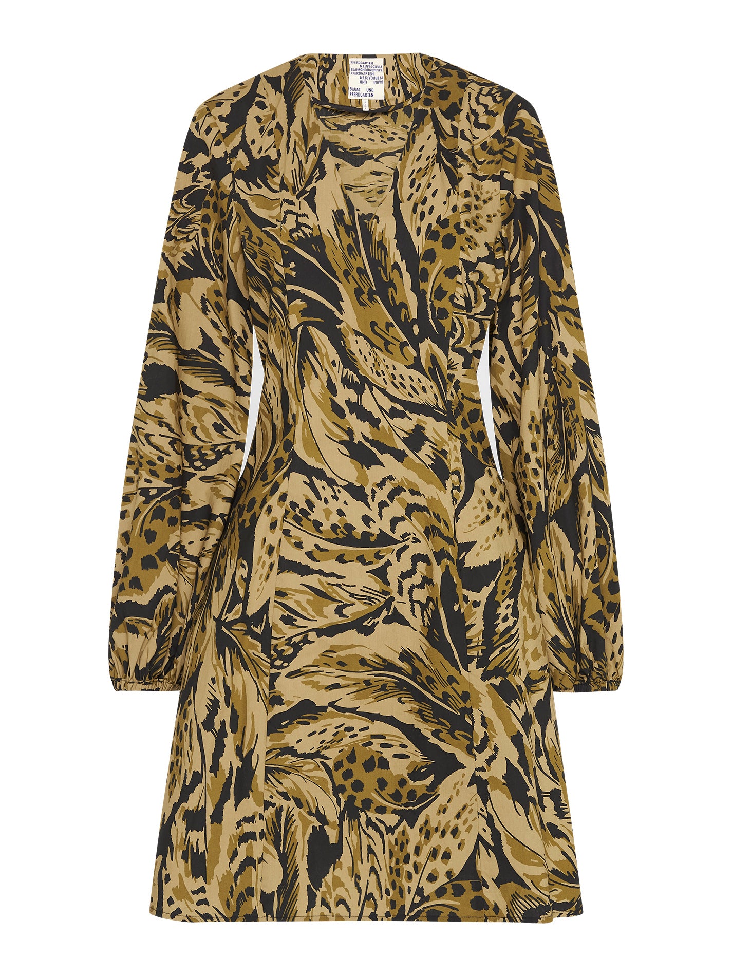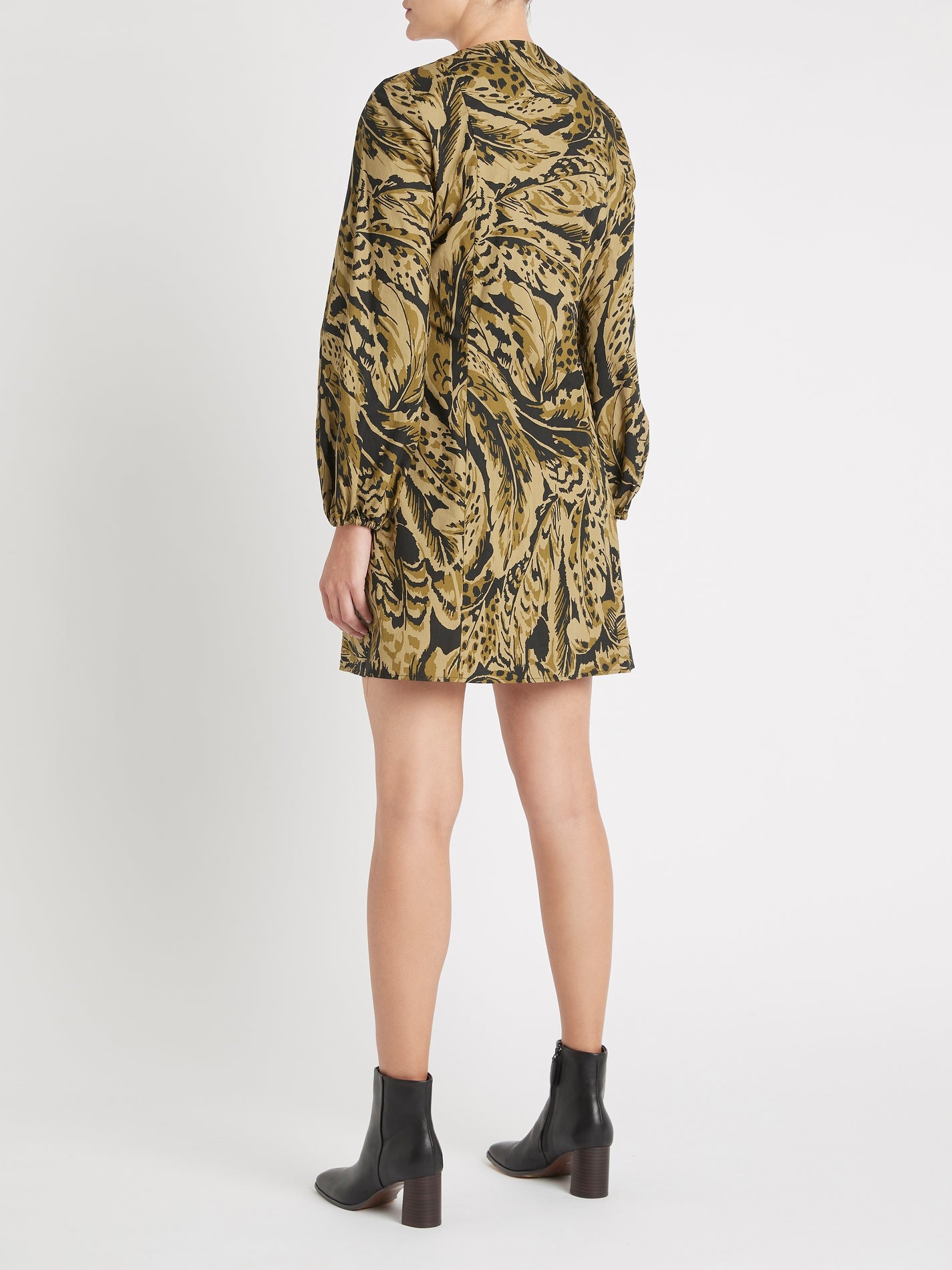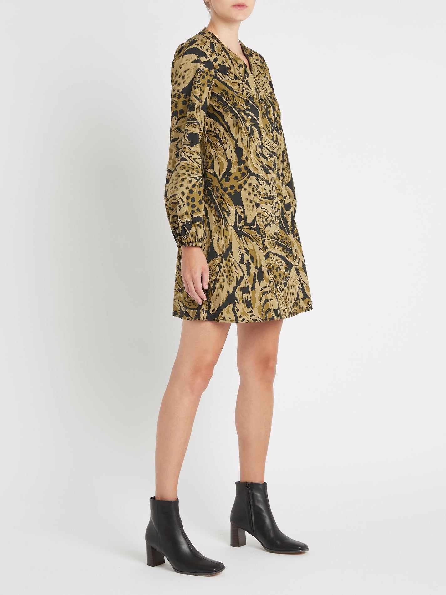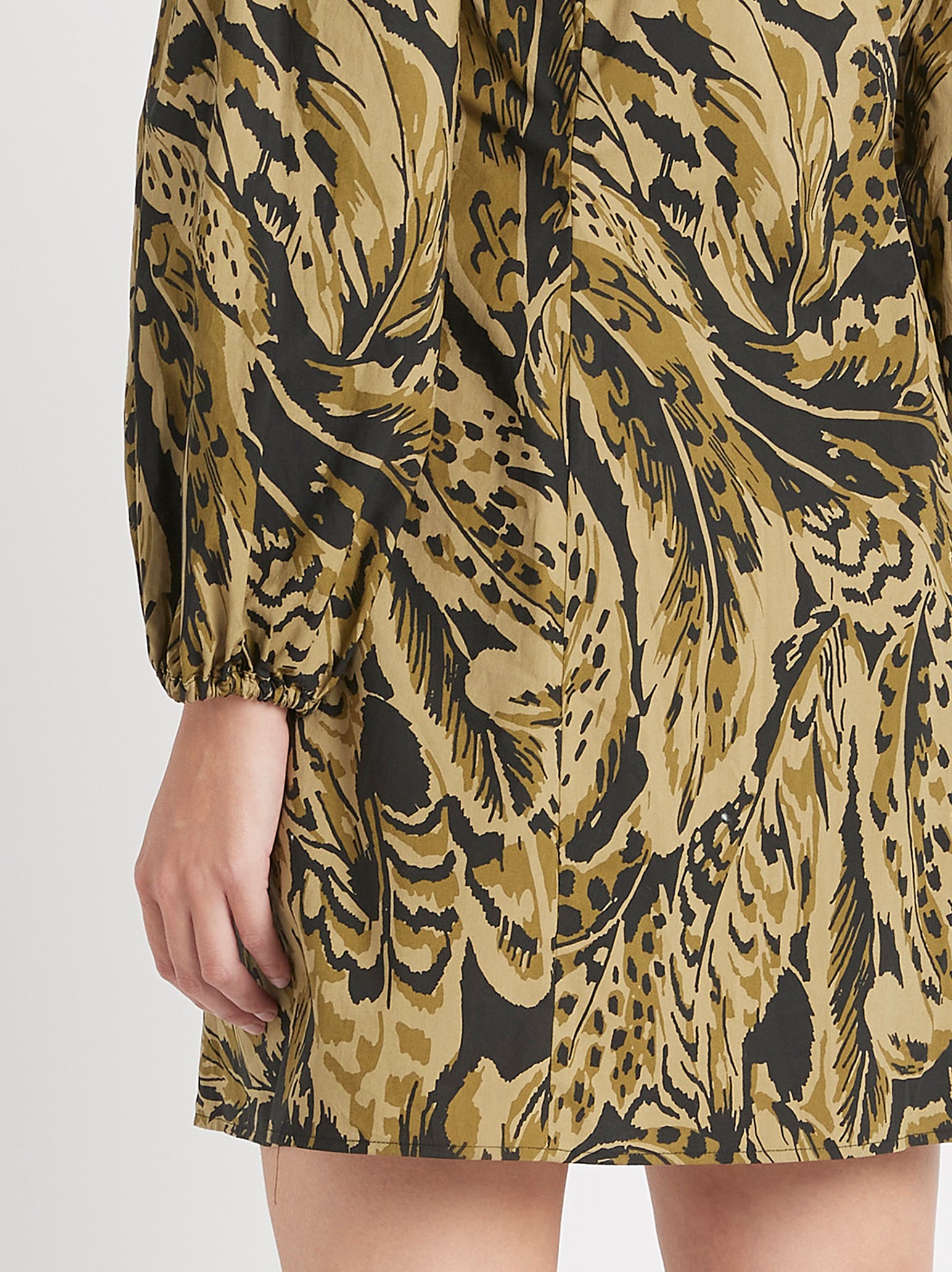 This stunning organic cotton dress from Baum Und Pferdgarten is the perfect 70's inspired style featured here in the stunning Olive Feather print. This shift style mini dress has a skirt that swings out at the waist, a v-neck and retro bishop sleeves, made from slightly stiffened organic cotton.