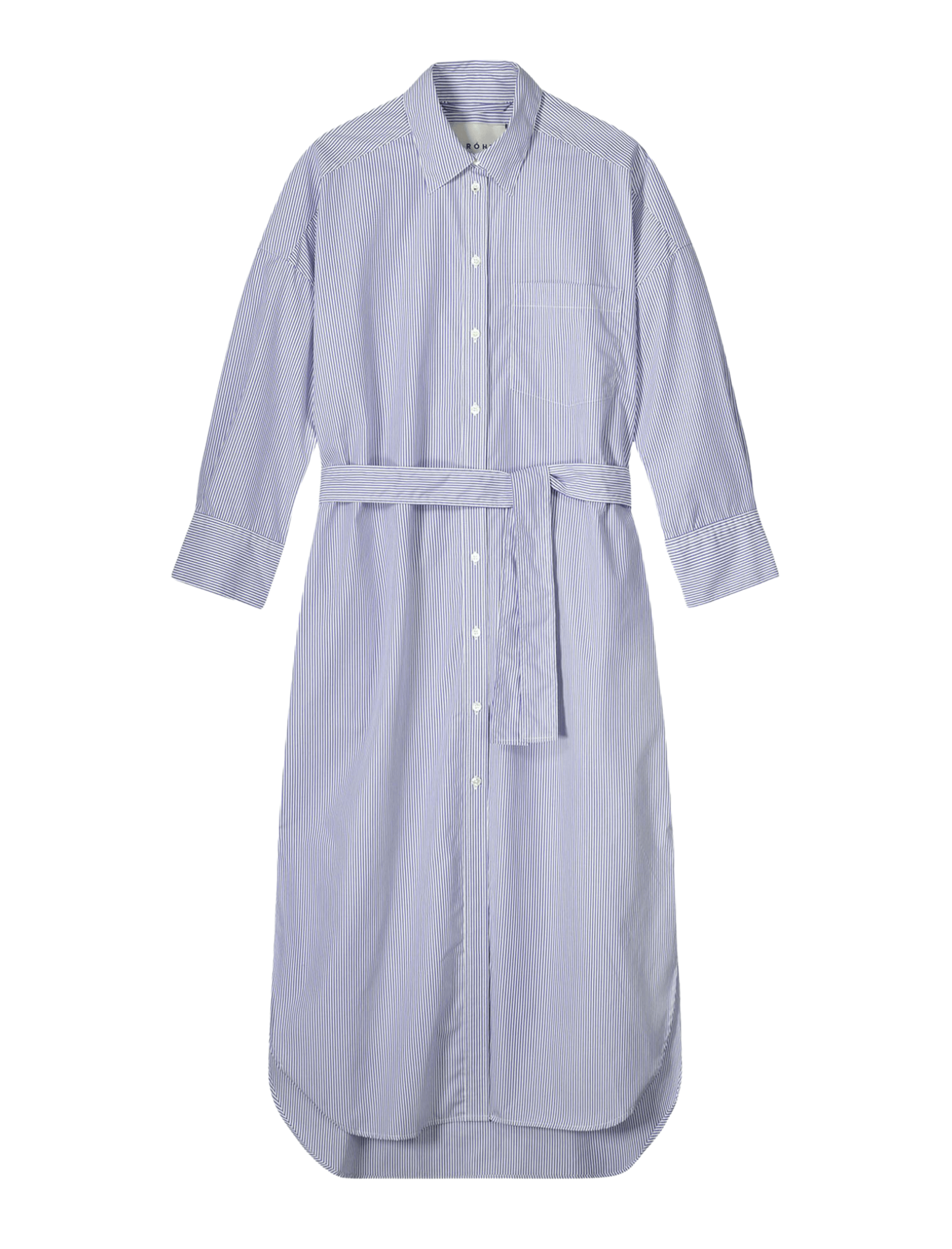 The Tilda Dress from Róhe is your ultimate summer shirt dress. This oversized style comes with a matching fabric belt so you can choose to wear it loose or fitted. Made from a soft woven cotton with a delicate navy pinstripe, this style will be a well loved addition to you vacation wardrobe.