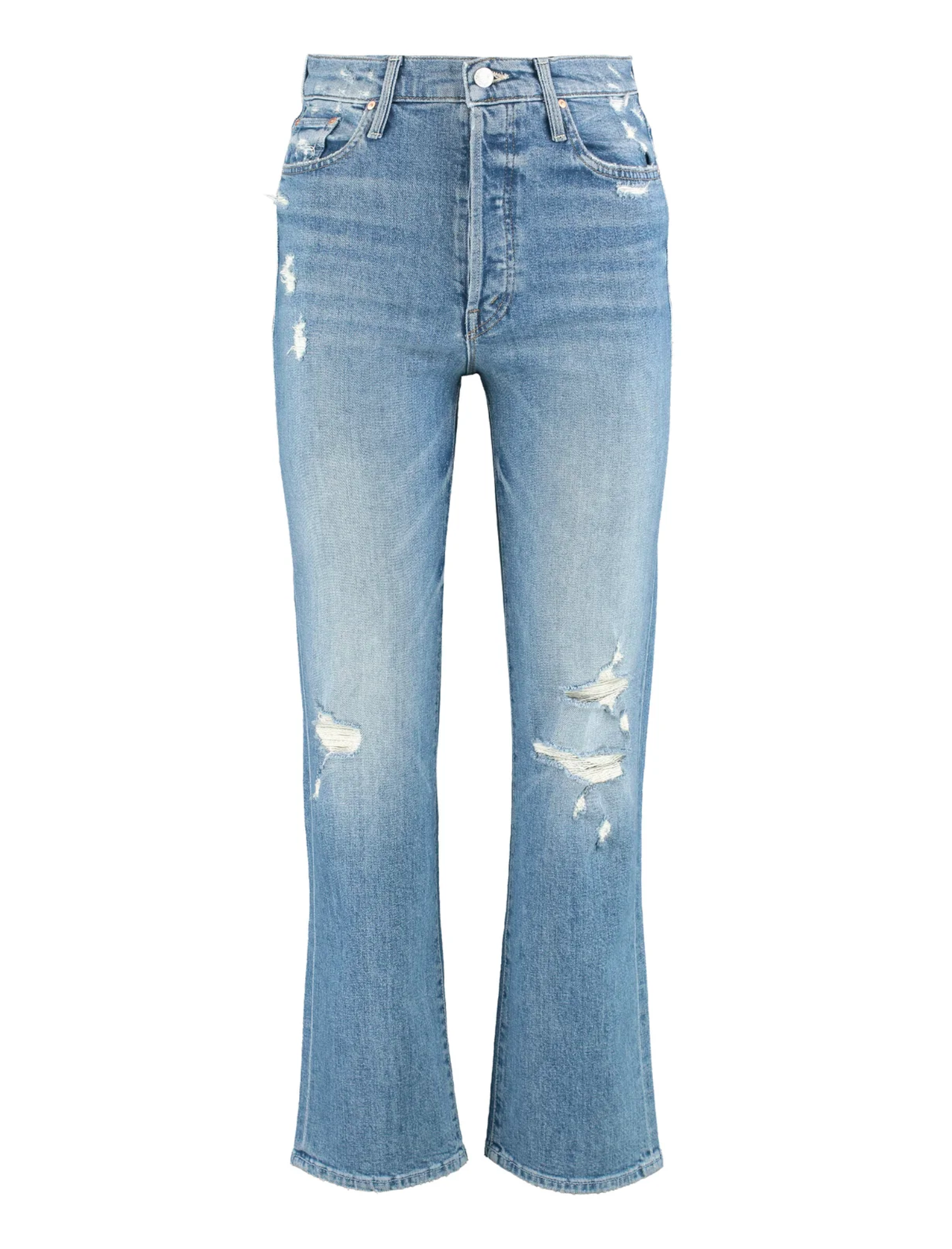 Gen Z have ben heard loud and clear. High rise and stright leg is the denim of the century and Mother has srved up the perfect pair with the Rambler Ankle Jan in Holy Melancholy. These super high-waisted jeans with a straight leg feature a button fly and an ankle-length inseam. Cut from SUPERIOR semi-rigid denim with subtle whiskering and fading, ripped knees and distressed details, Holy Melancholy is a mid-blue wash.