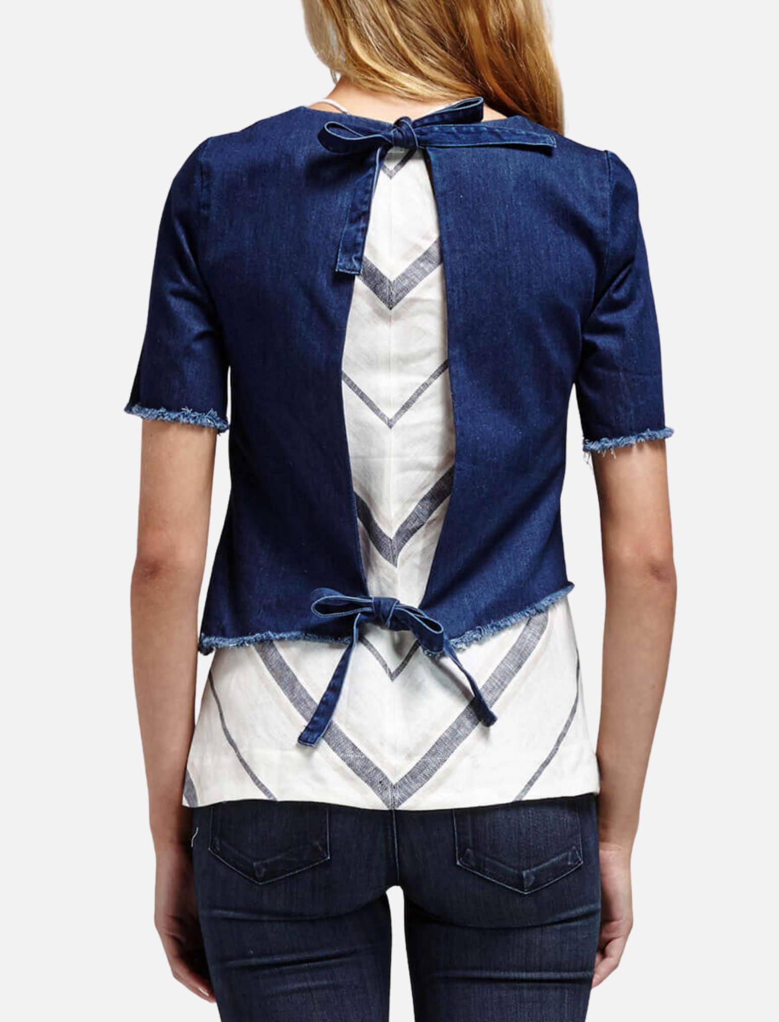 The N / Nicholas Denim Asymmetric Tie Back Top takes the denim trend to another place. This T-shirt style top is crafted from soft, lightweight denim, offering a fresh and comfortable feel, especially when it's hot outside.