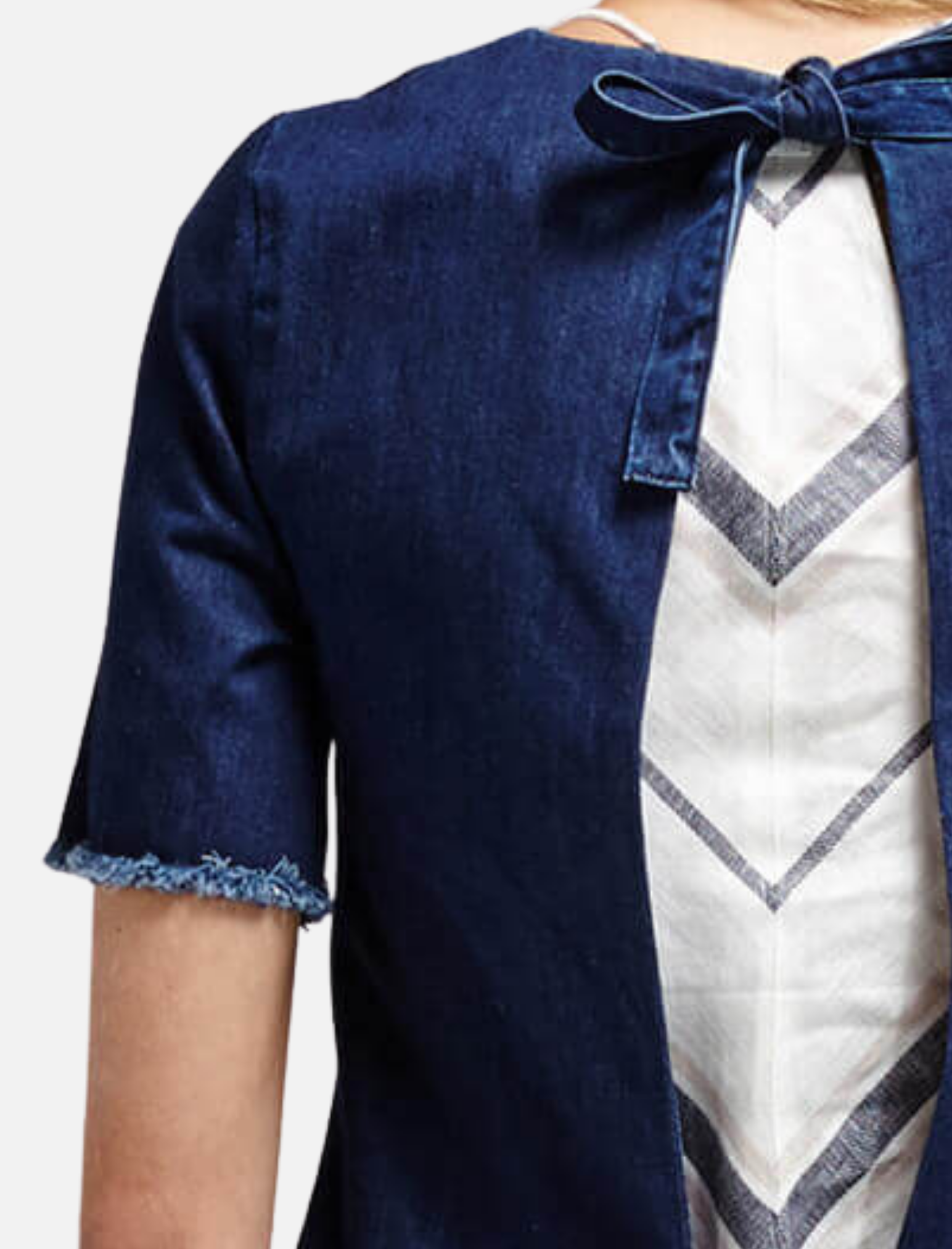 The design features a modern, asymmetric hemline and chic elbow-length sleeves, creating a flattering silhouette. The most unique detail is the dual tie closures at the back, which not only add a stylish focal point but also allow for an adjustable fit and breezy, open feel.