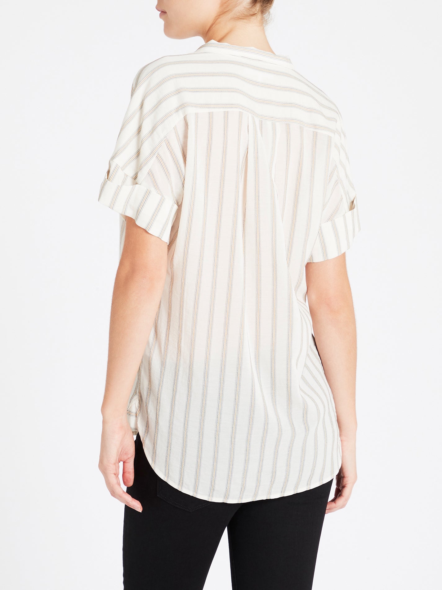 A modern take on the classic short sleeved button down, the Clean Collar Short Sleeve Shirt in Off White Multi by Frame Denim is the answer to your fashion prayers. With a modern mandarin collar and cuffed short sleeves, wear this Frame Denim shirt on repeat with linen or denim for an effortlessly cool look this season.