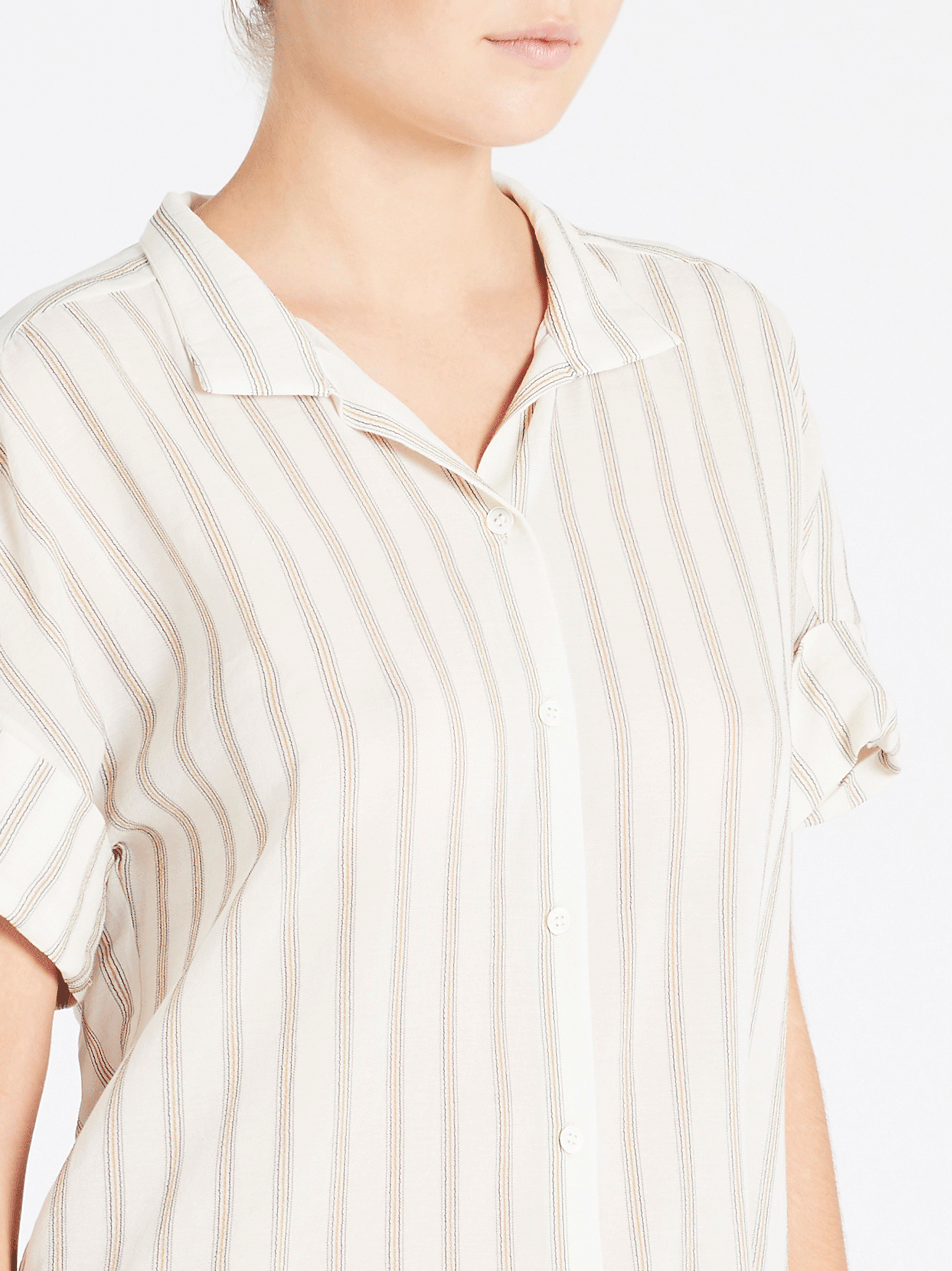The Frame Clean Collar Short Sleeve Shirt in Off White Multi is made from 63% Viscose, 37% Cotton