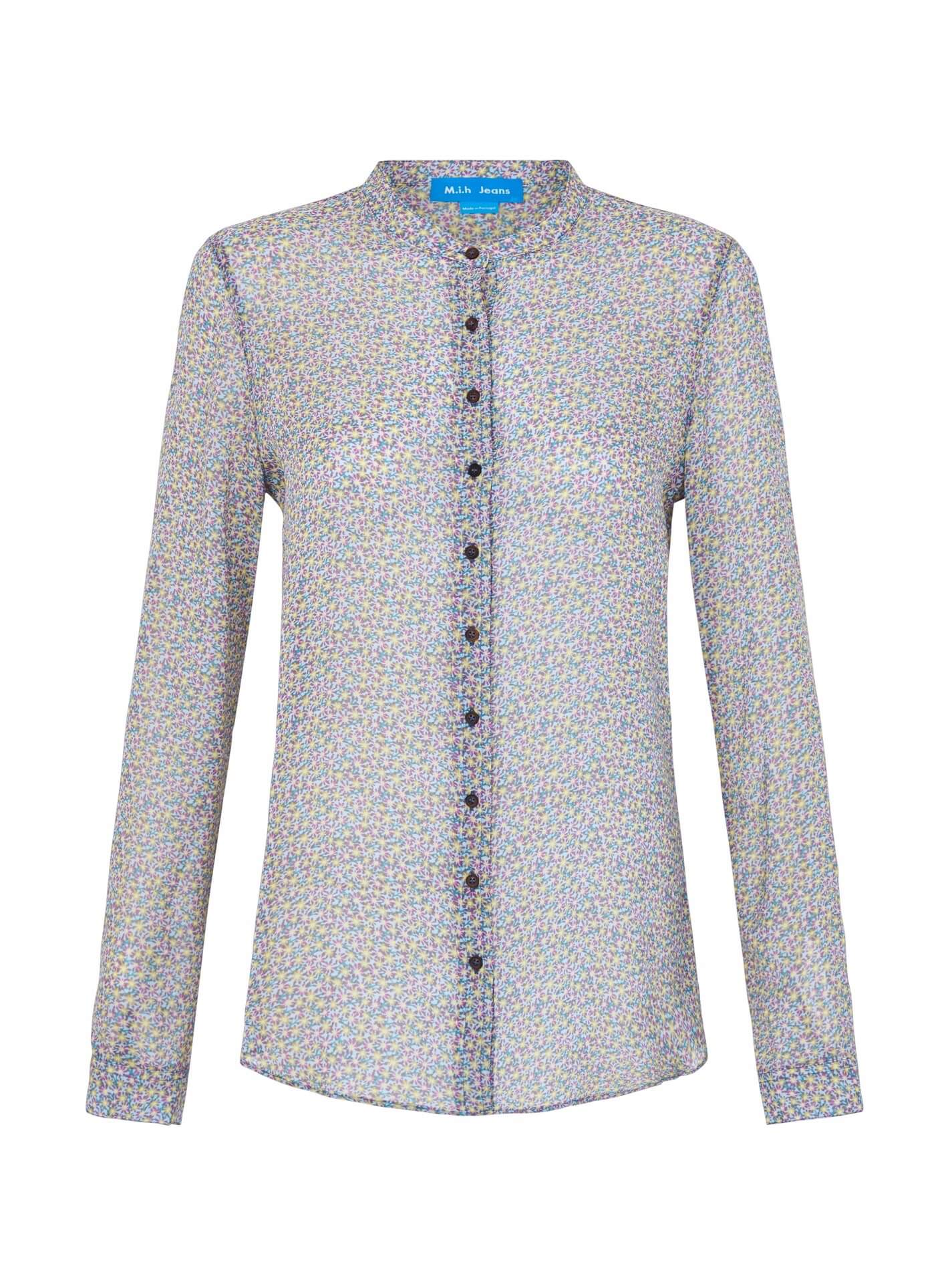 The M.i.h Jeans Collarless Evelyn Shirt is an ultra lightweight silk georgette shirt in a subtle multicoloured floral print. This collarless style is constructed in a slim fit featuring a classic cuff and multiple buttons down the centre front placket. Pair this shirt with your favourite denim for the perfect day to day look with a slightly vintage vibe.