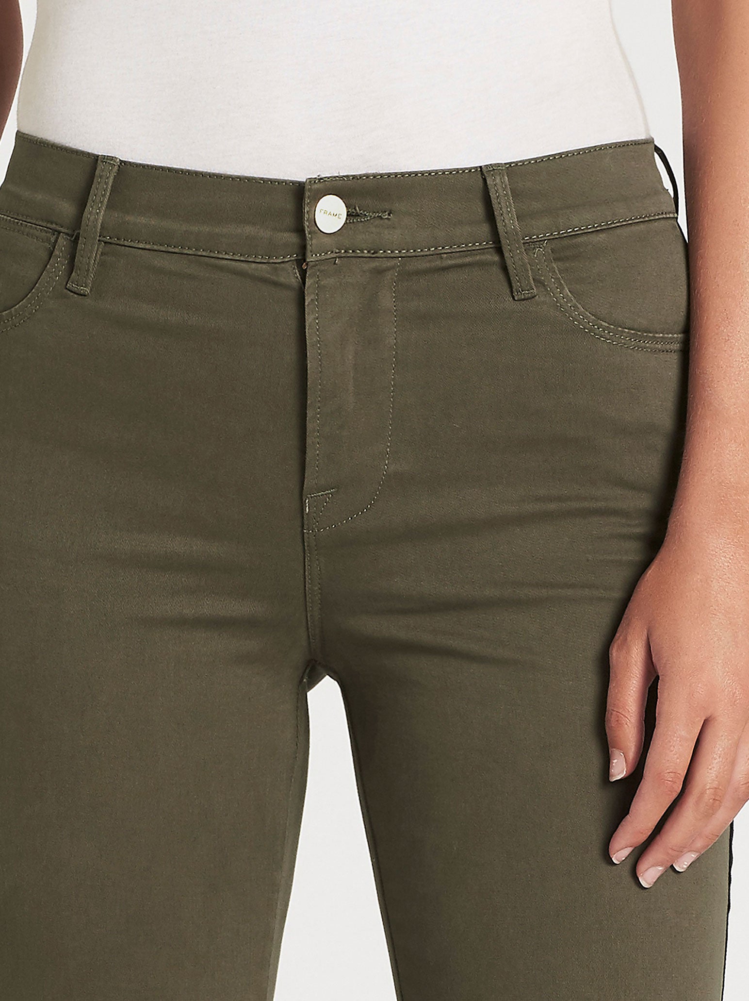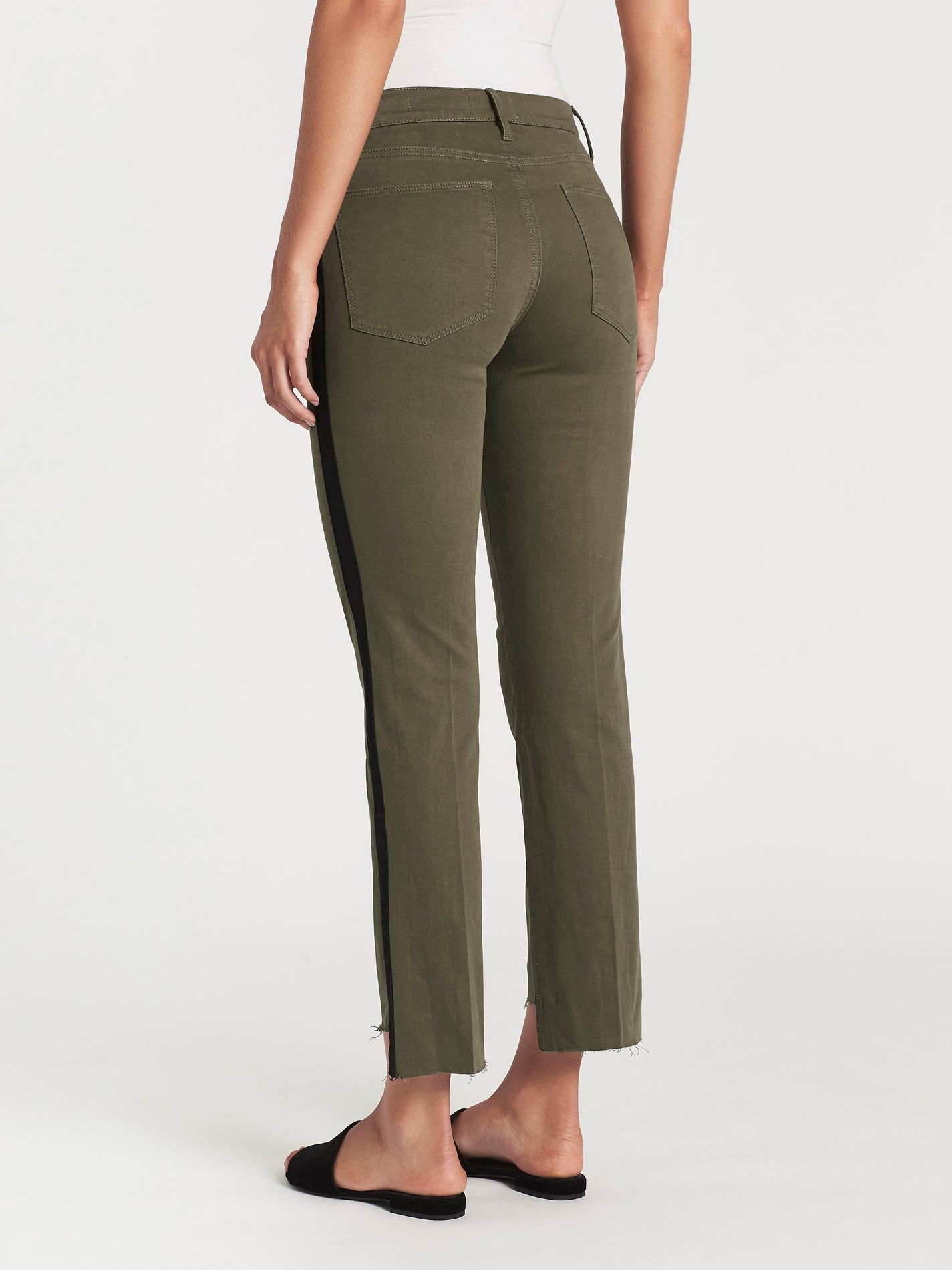 The Frame Denim Le High Straight Raw Stagger Tuxedo Tape Jean in Army Green are made from 91% Cotton, 7% Polyester & 2% Elastane