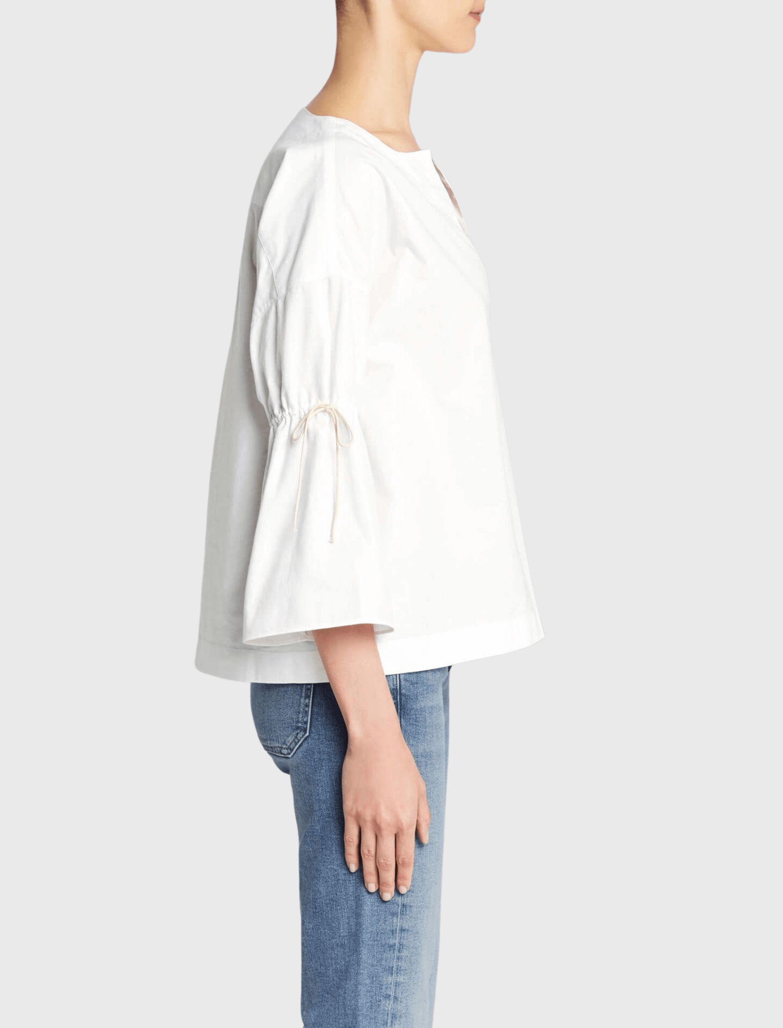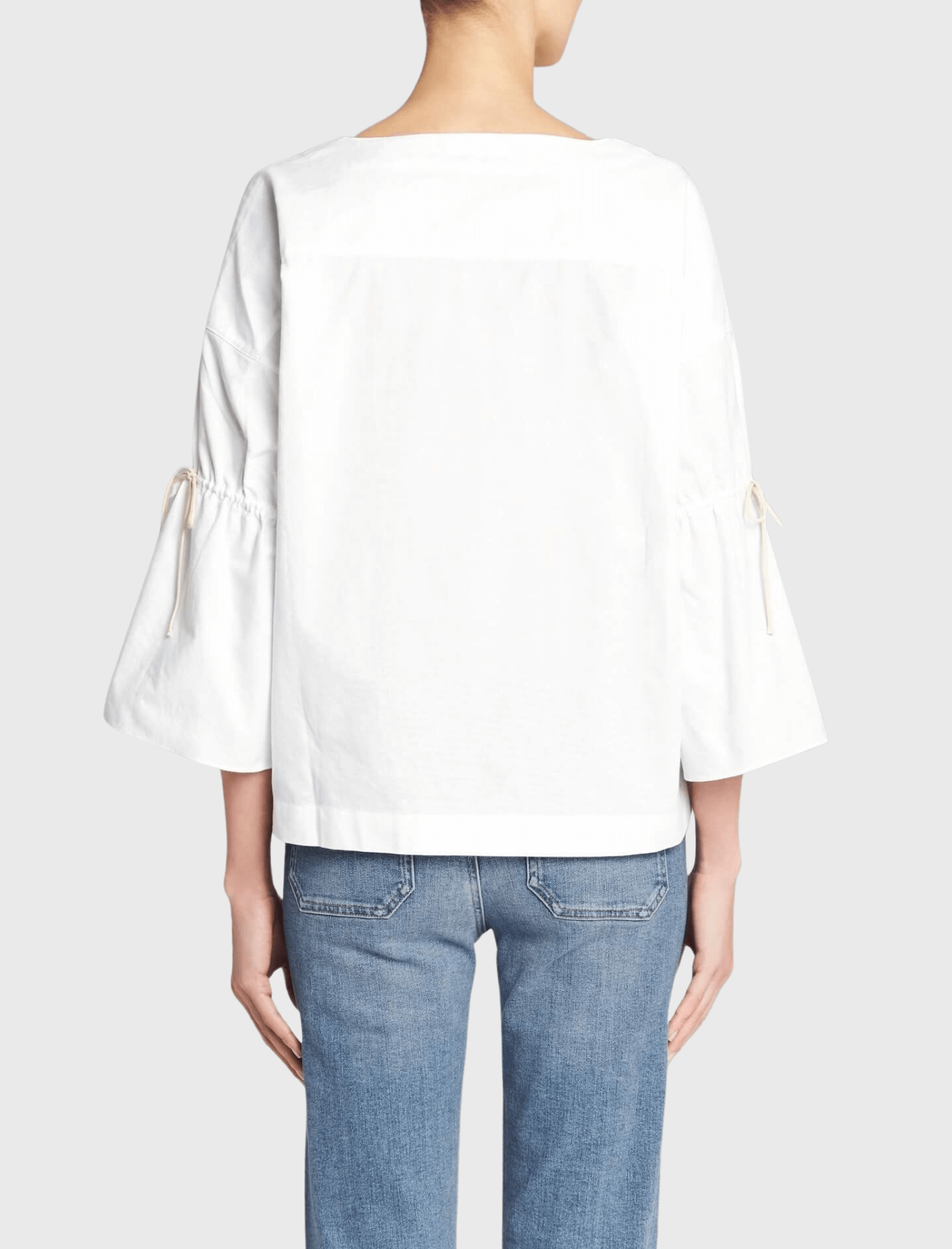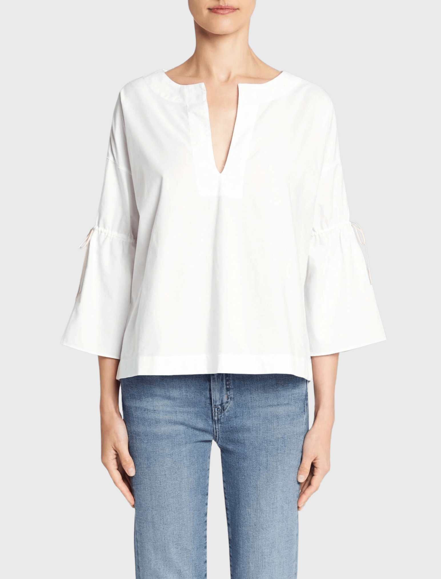 The Katty Top by M.i.h Jeans is a modern take on the classic white smock shirt. Constructed in a white oxford cotton this top features 3/4 length bell sleeves with draw string ties for added volume, a classic smock style v neck opening and a curved hemline for easy layering. We're teaming ours with high waisted straight leg jeans and classic black slides.