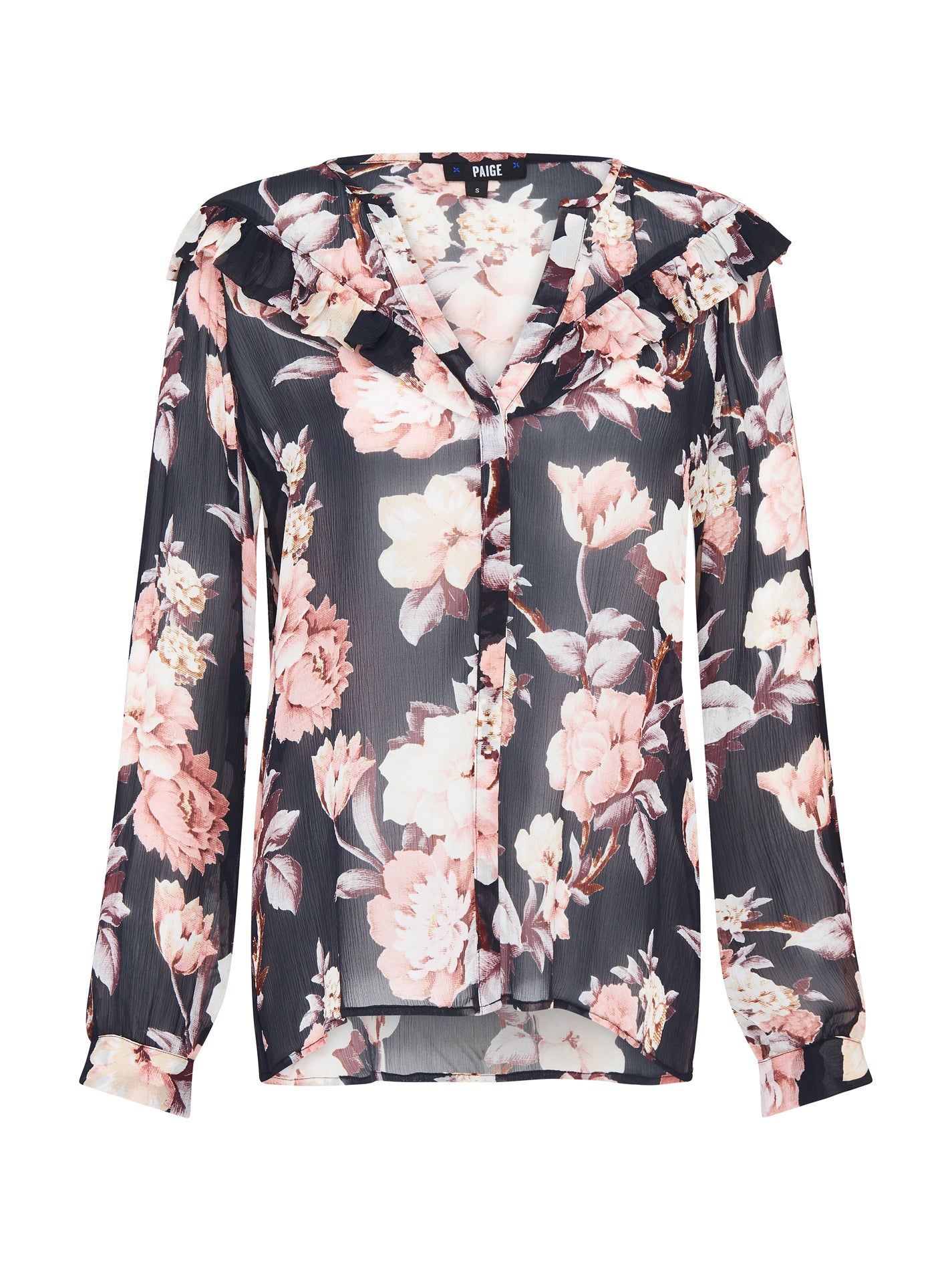 Soft and romantic, the Paige Amore Blouse in Evening Sand / Black is made from 100% silk to delight your skin. This button-up blouse has a ruffle detail, a gorgeous floral print, and a wide neck tie. It's love at first sight- it's the Amore Blouse.