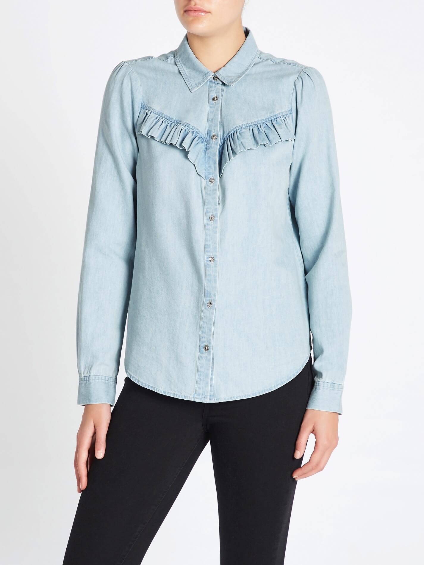 Pretty and perfect is the best way to describe the Layda Shirt from Paige. This soft light blue denim shirt has a western vibe and features a button down placket front with feminine ruffle details across the front and back.