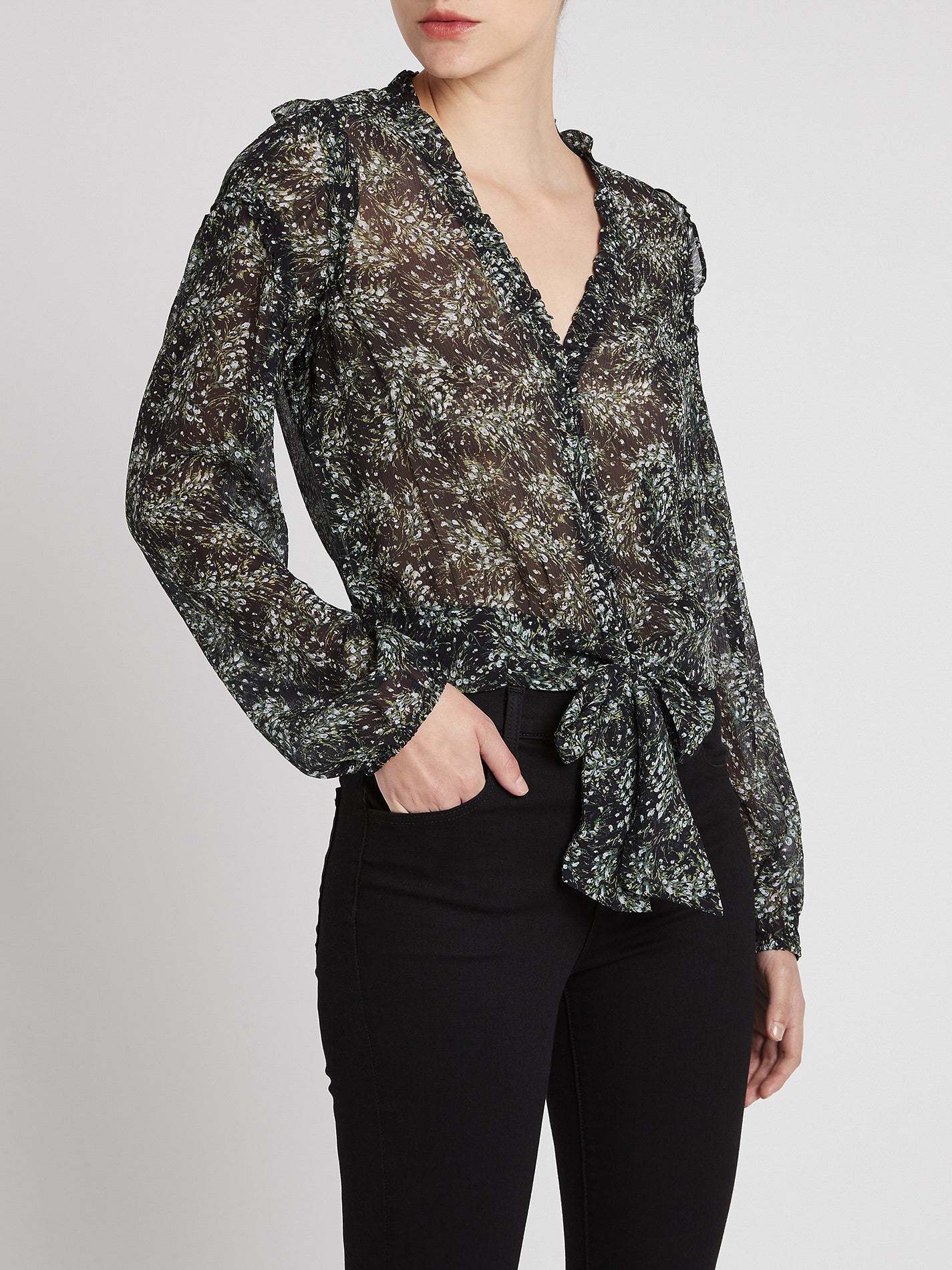 Evoke effortless cool girl femininty with the Tulia Blouse in Black by Paige. Crafted from ultra luxe silk, this artfully designed button down blouse features a deep v-neckline that is adorned with a ruched trim, a stunning abstract floral print and is finished with a cropped silhouette with a front tie and elasticated sleeves. Team with a chic lace adorned cami and noir denim and boots for a look that will take you from day to bar.