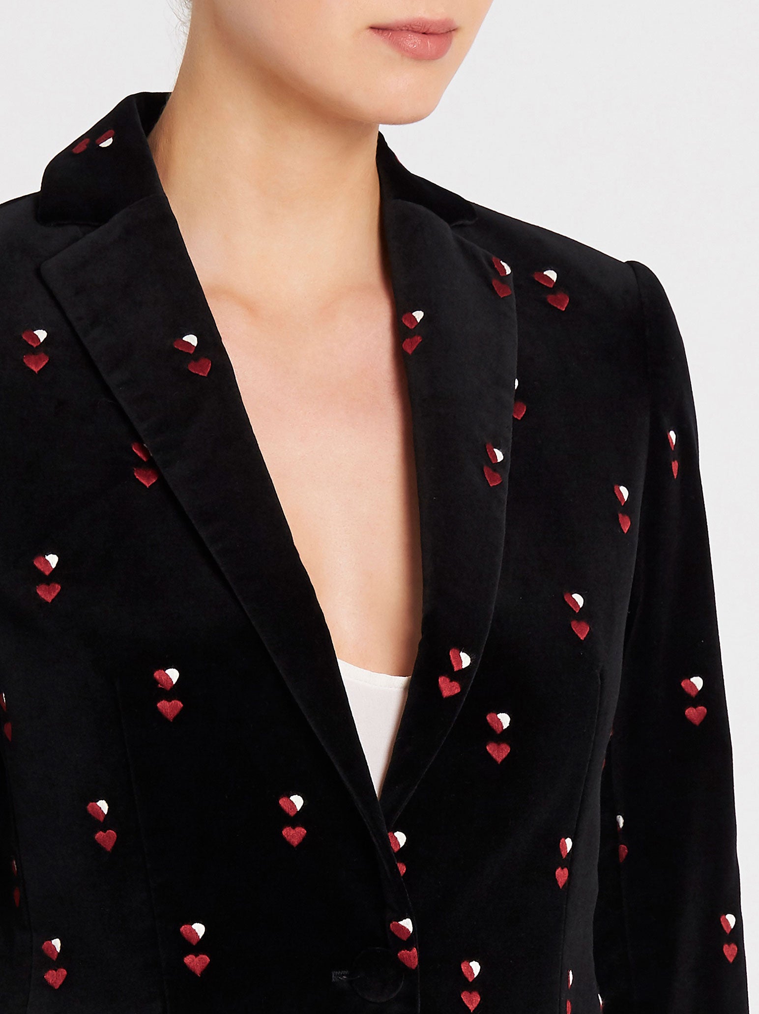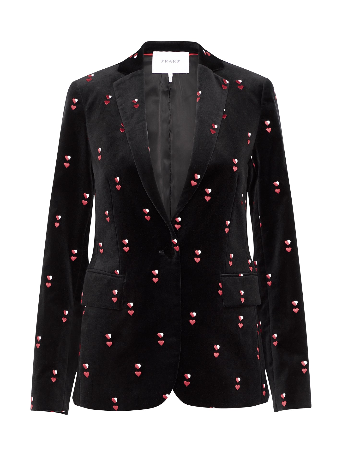 Evoke effortless chic ease with the Classic Blazer in Noir Multi by Frame Denim. Constructed in an ultra soft velvet feel cotton blend this charming classic blazer features a classic silhouette and collar lapel with a single button closure and is finished with a red and white heart pattern adding a hint of sweetness to any outfit.