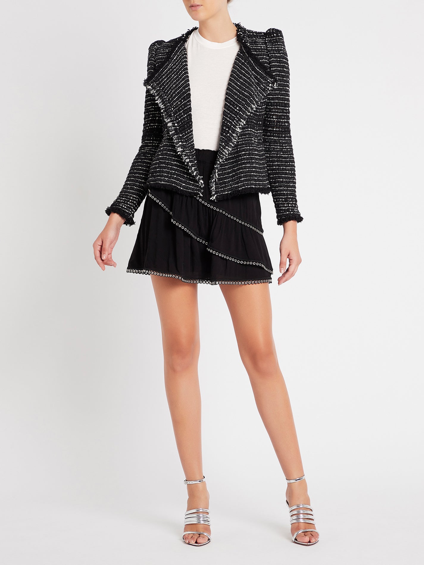 Fun and flirty the Nisia Skirt by IRO has arrived in Black. Constructed in polyester crepe this mini skirt features asymmetric tiered ruffle layers with silver eyelet details and is finished with an elasticated waistband. Team with a cami and layer with a leather jacket for a rock and chic inspired style.