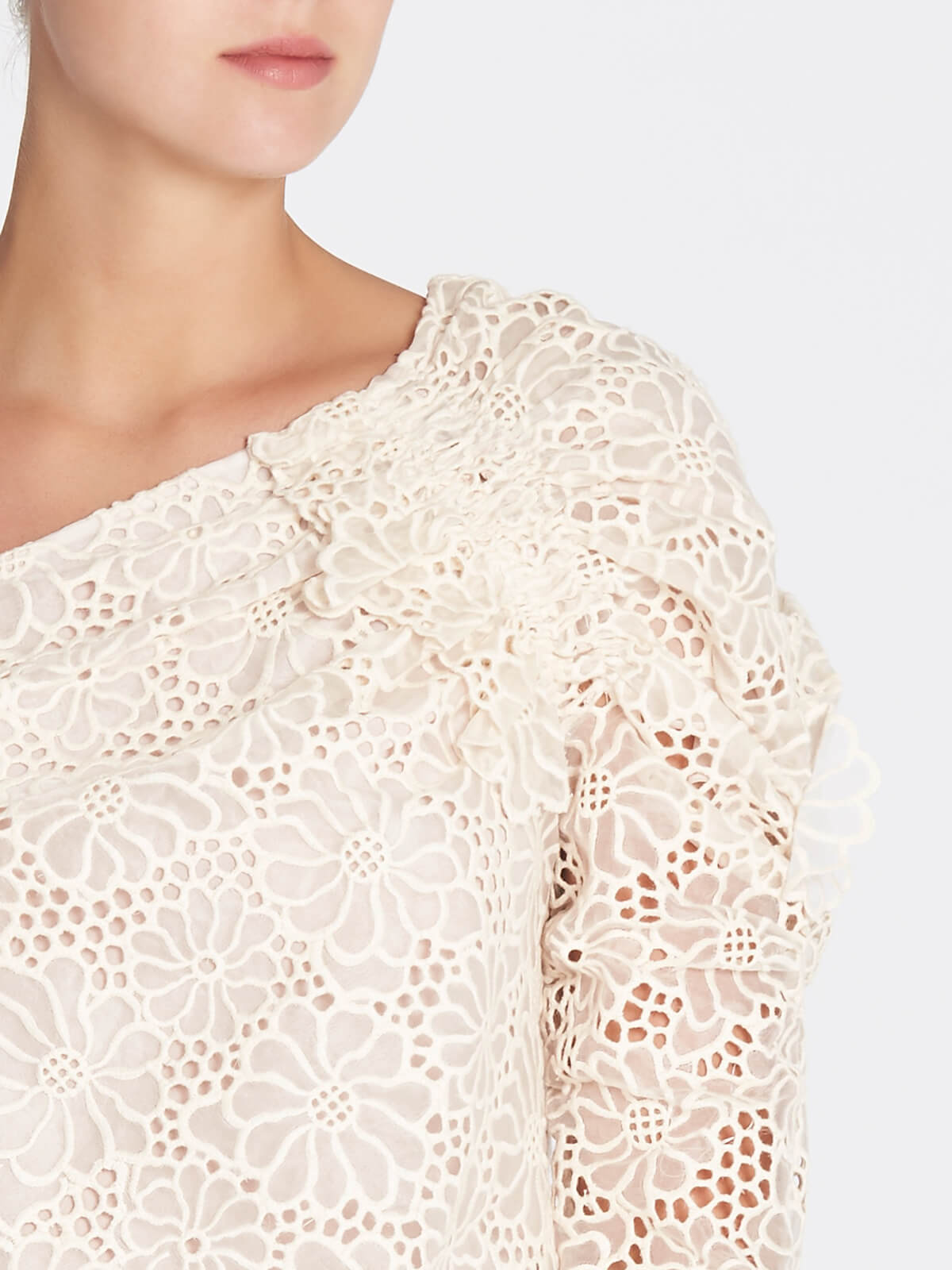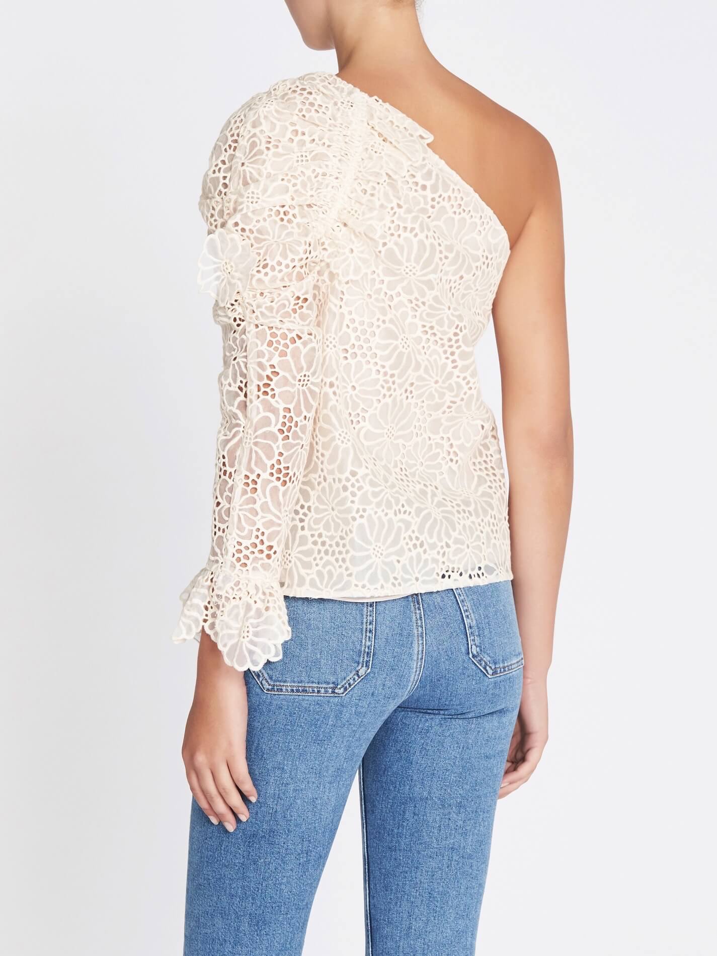 The Rebecca Taylor Malorie Top in Chalk is a retro-inspired statement piece that will add some flare to any wardrobe. Constructed in a stunning off-white silk with floral embroidery creating a romantic lace effect, this must have top features a one shoulder neckline, hidden side zipper closure and subtle gathering finished with a ruffled trim.