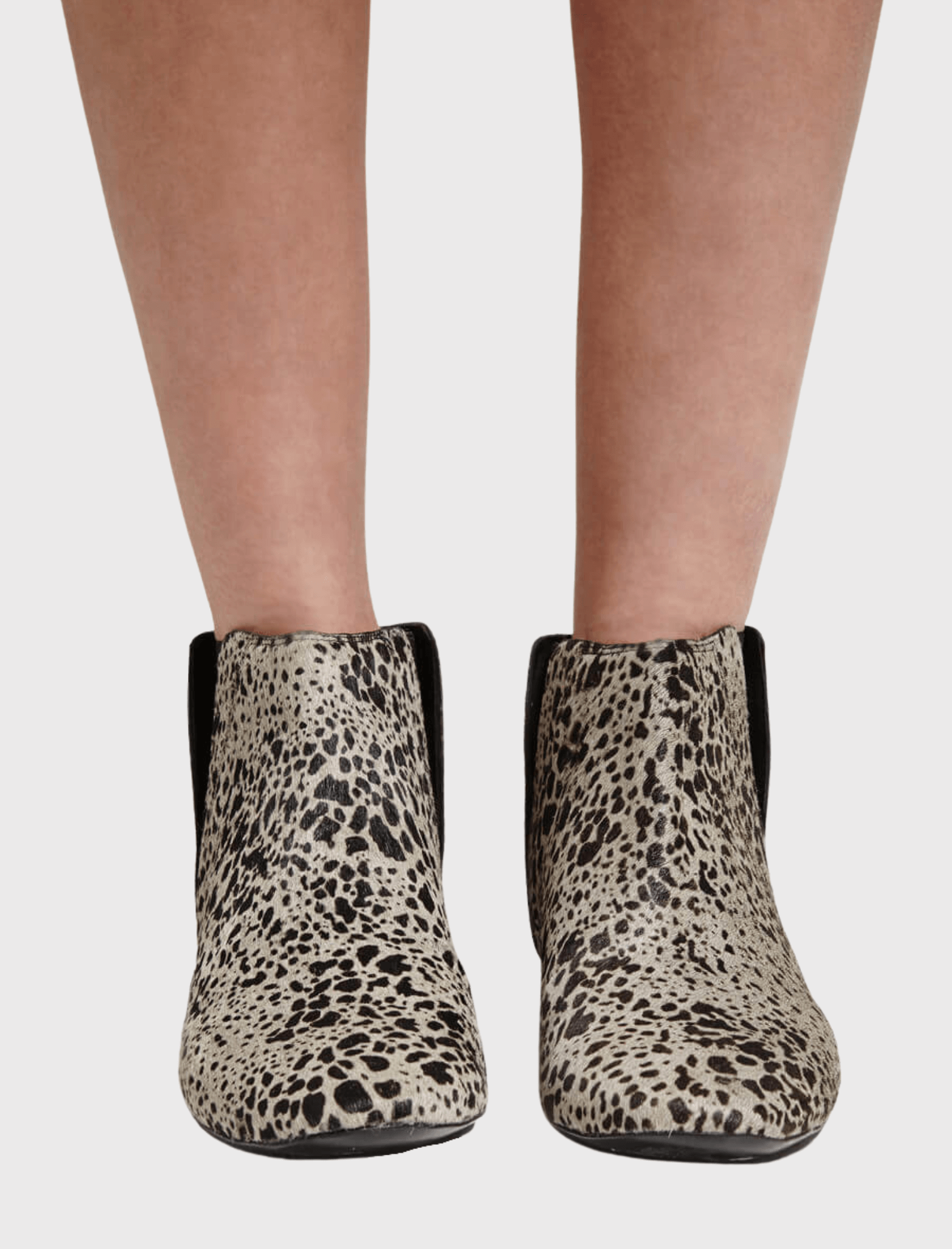 Featuring a trendy spotted hair calf design, these boots are easy to pull on and feature elastic goring on both sides for a comfortable and secure fit. The rounded toe and black sole add a touch of classic style, making these boots perfect for any occasion.