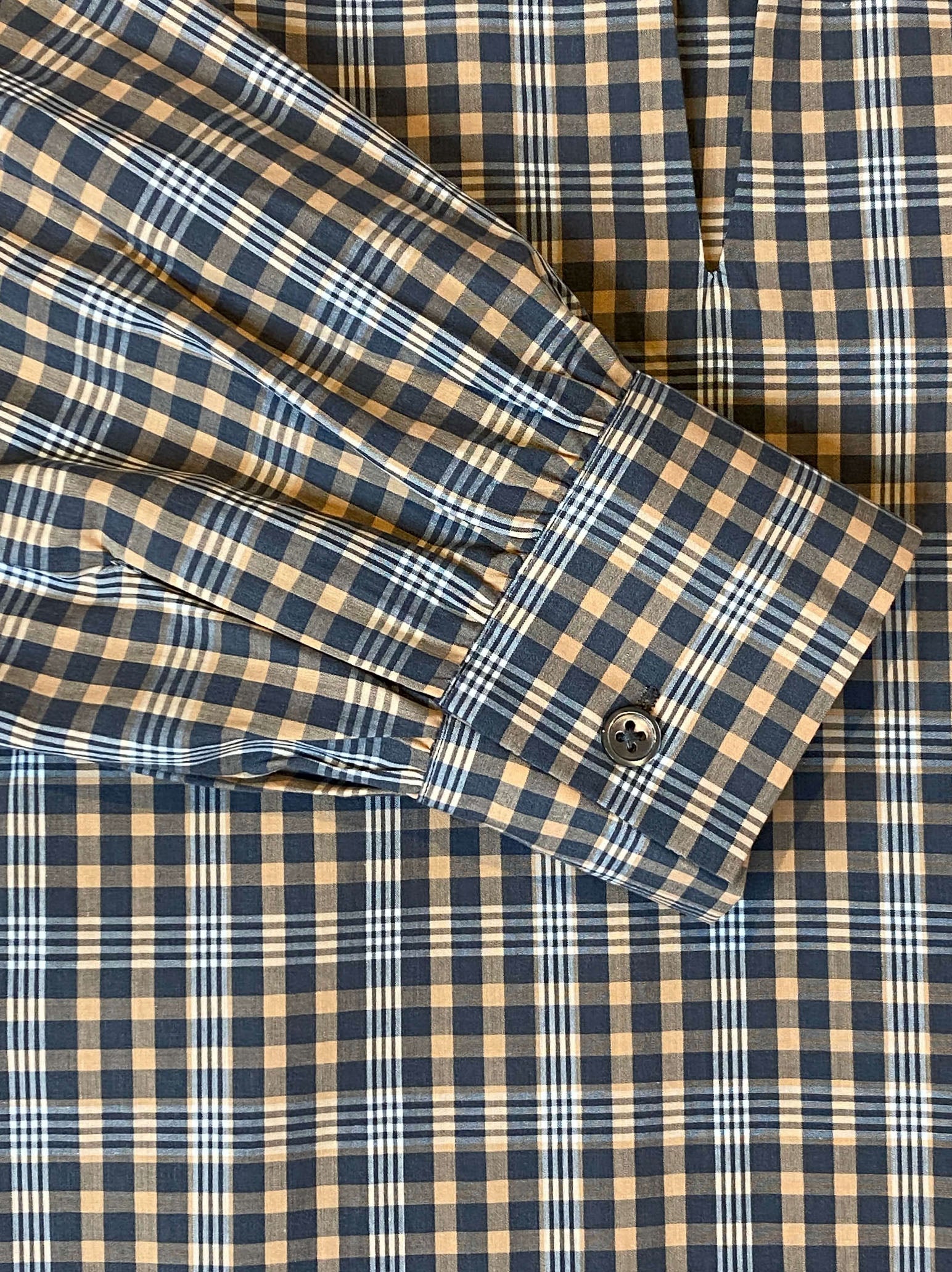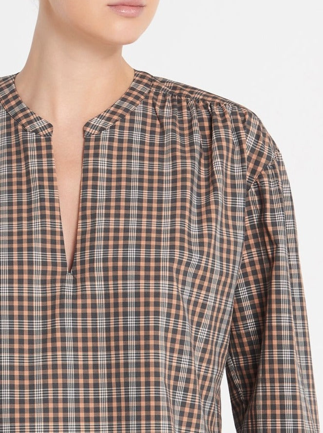 Nail Scandinavian street style the Vera Shirt in Midnight Melon White is a poplin, long sleeve, charcoal grey v-neck top featuring faded melon orange and soft white plaid design throughout. Designed with an oversized fit, banded collar, dropped shoulder, and full sleeves with shirring. This feminine and strong top will effortlessly transition you from season to season.
