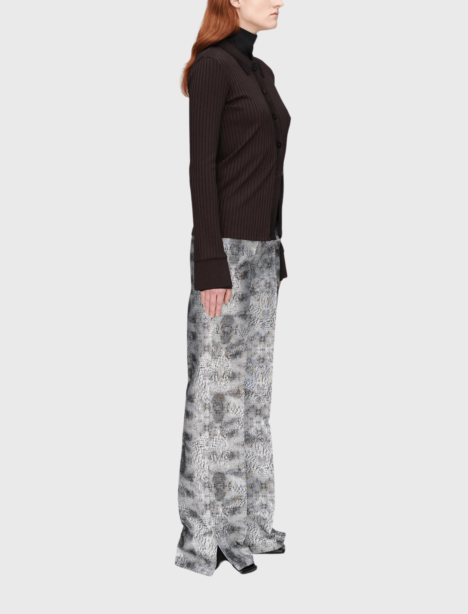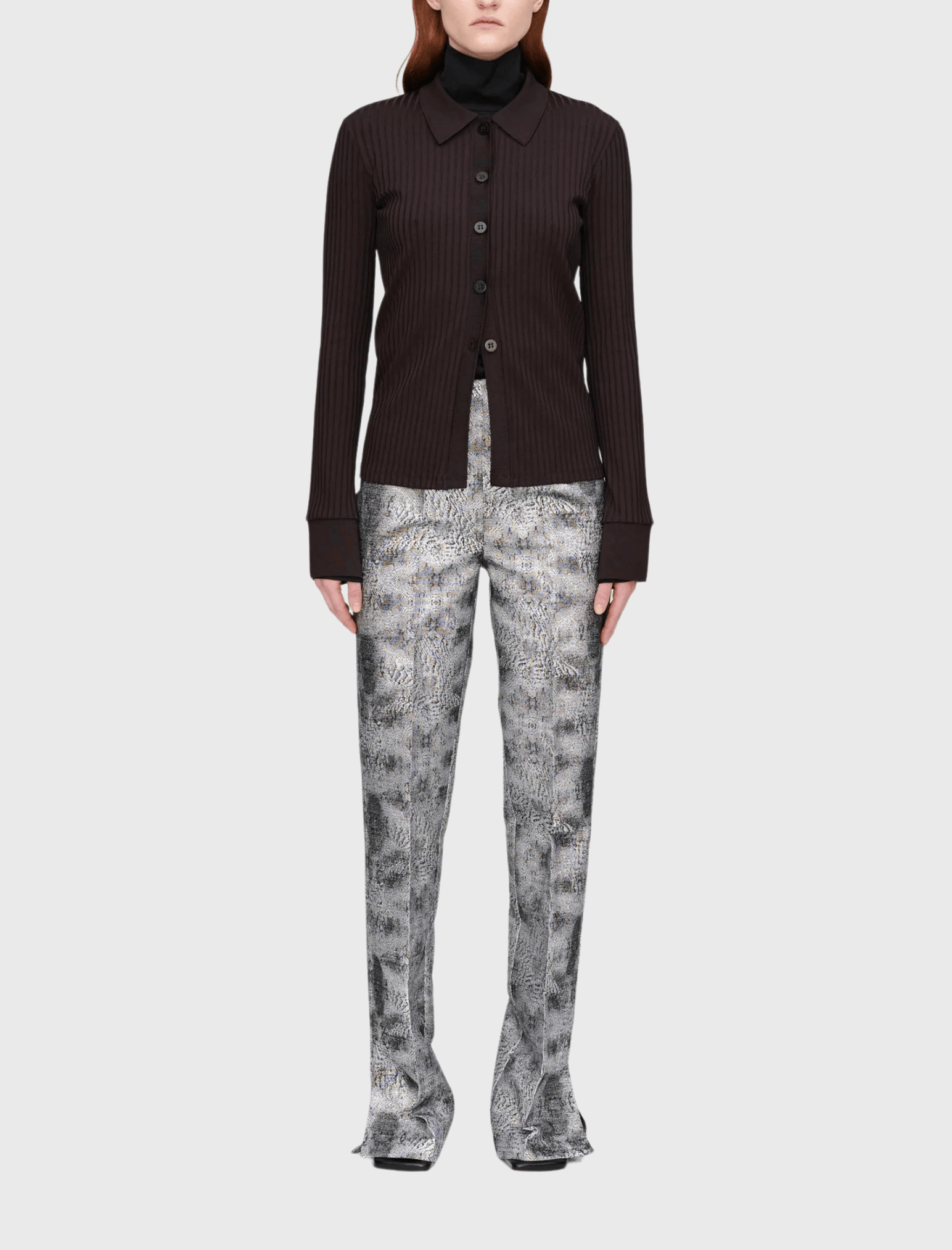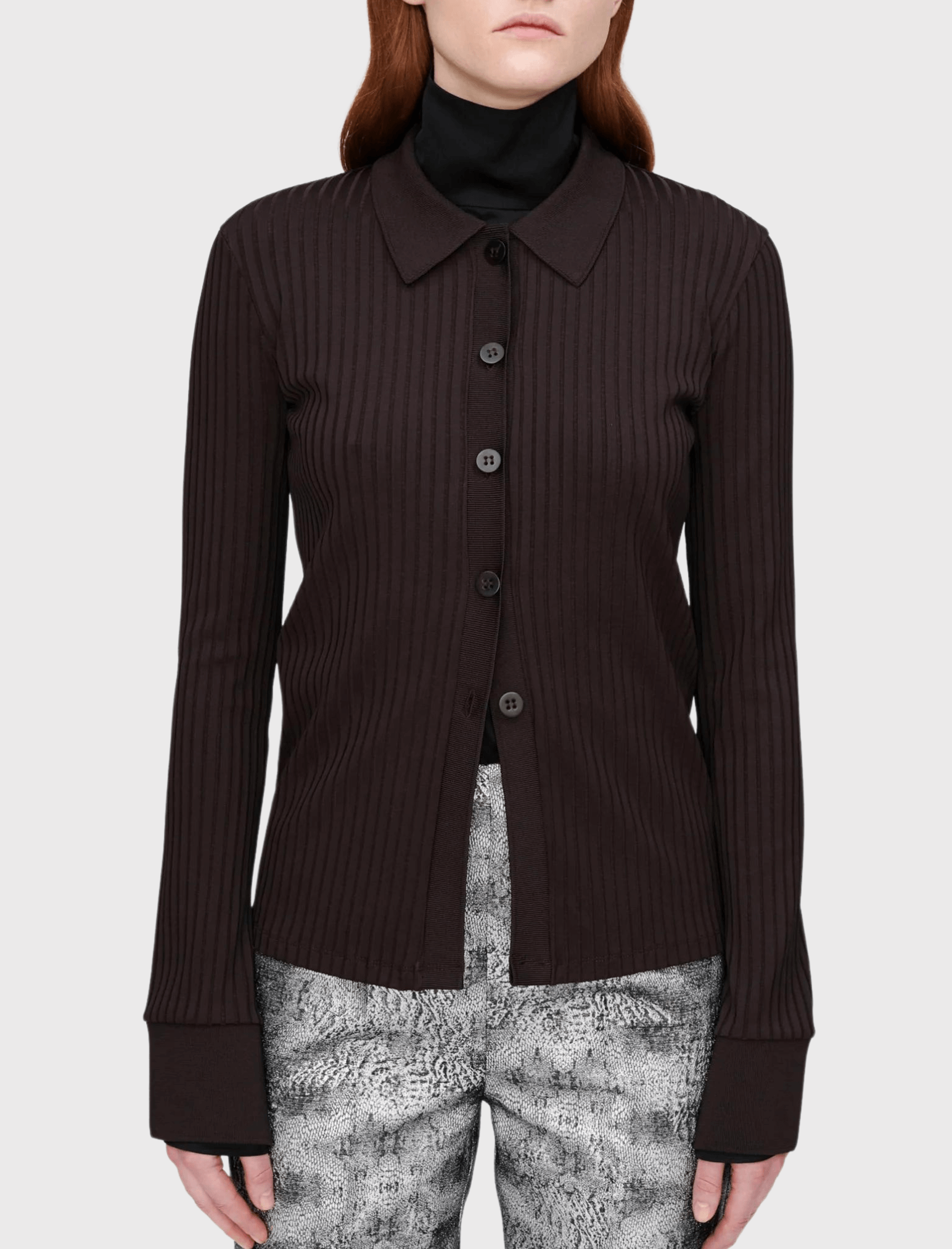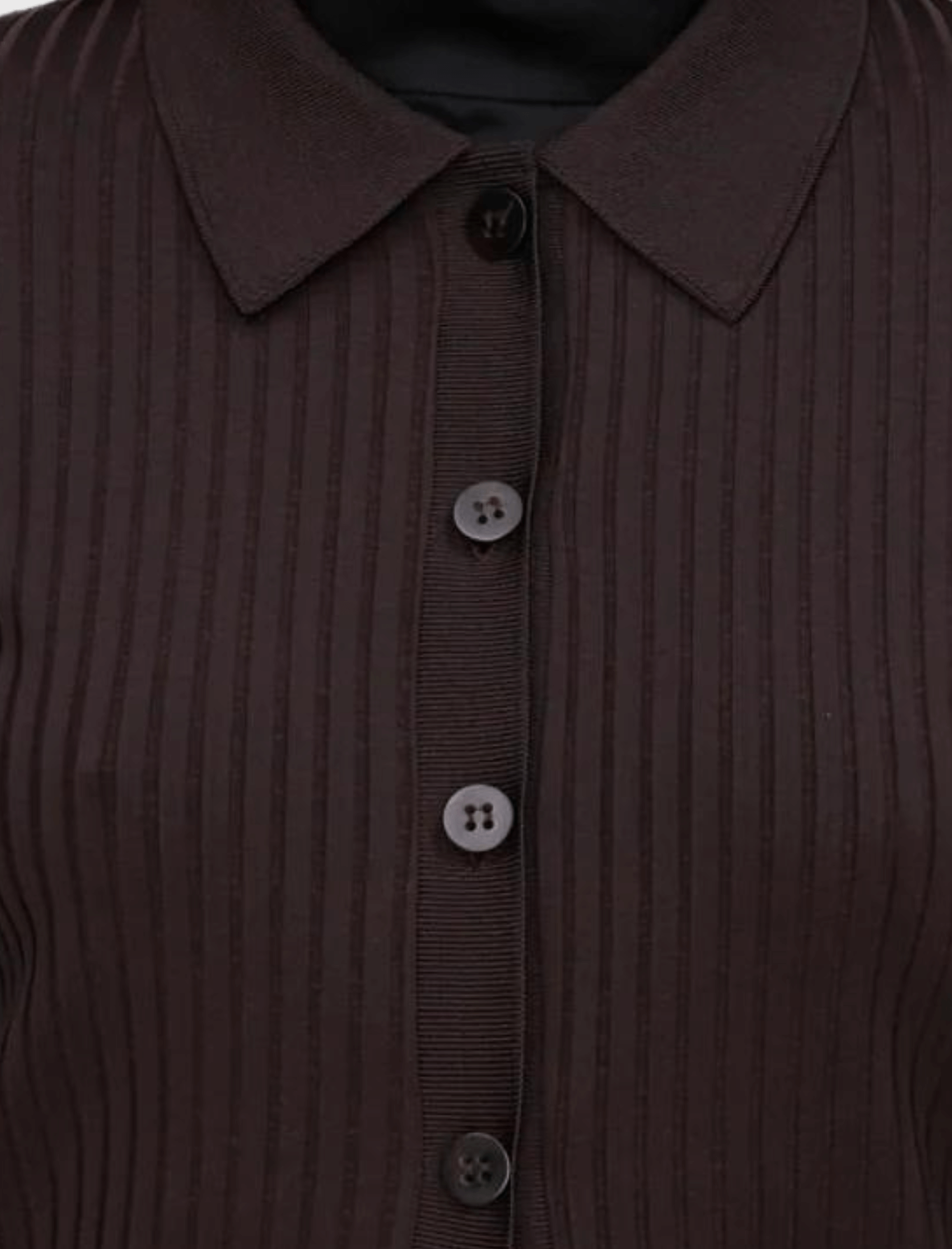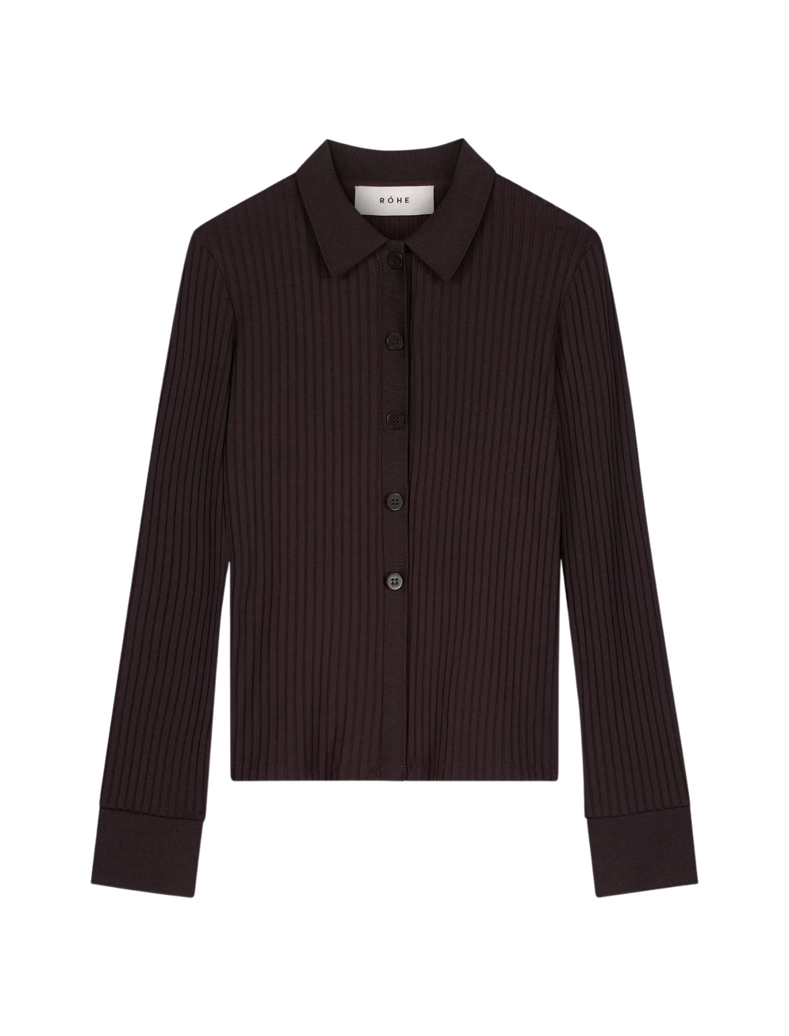 Feel sleek and elegant in the Róhe Diva Top in Smoke Brown. This Italian-designed polo has a ribbed retro fit and button down closure. Tucked into slacks or a pencil skirt, the Diva Top will make you feel incredibly chic.