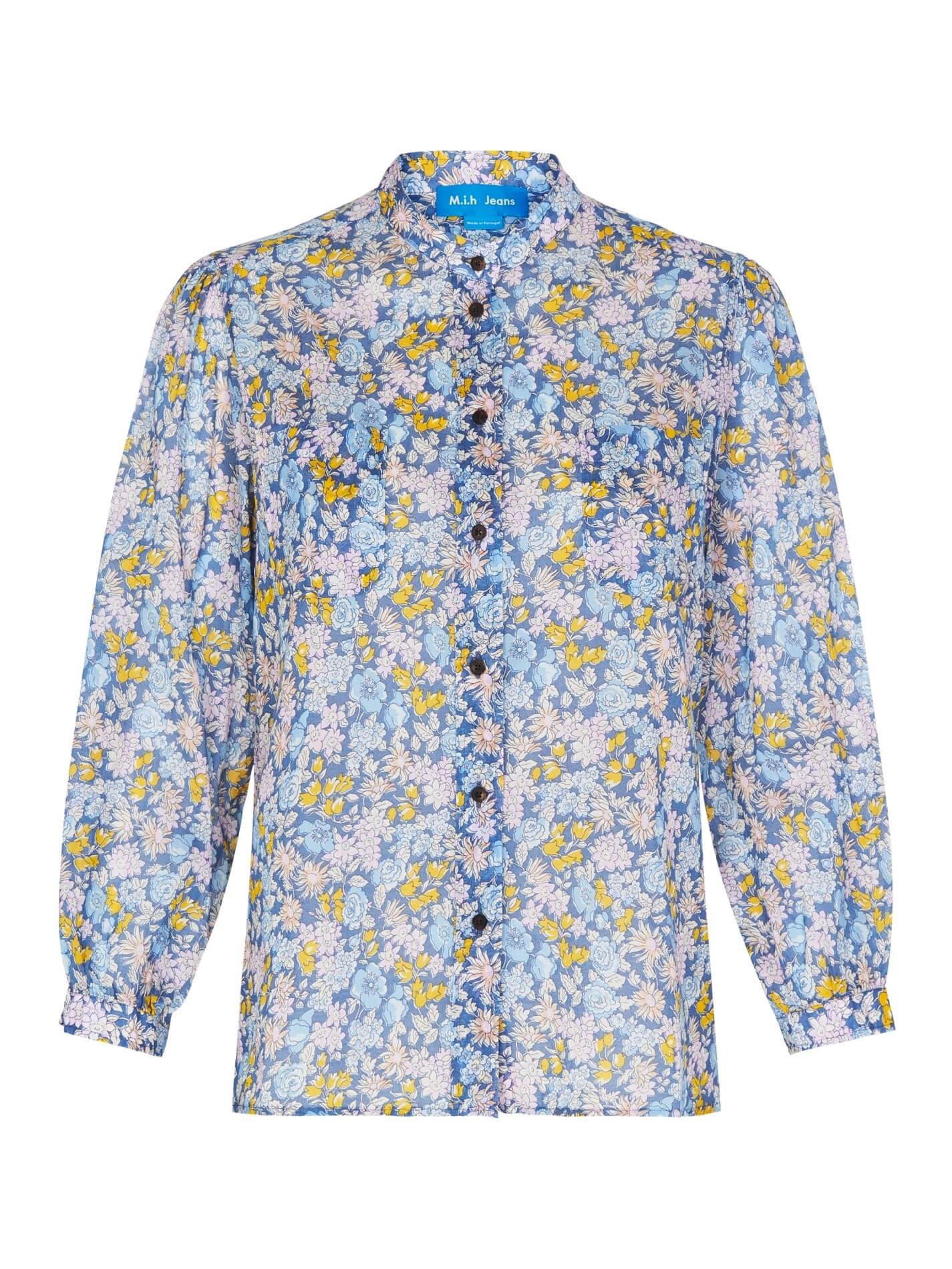 The M.i.h Jeans Lilli Shirt in Treelove print is made from a delicate lightweight cotton voile printed with a charming mini floral in blue, pink and yellow. Featuring a 3/4 sleeve, button down front and a mandarin collar.