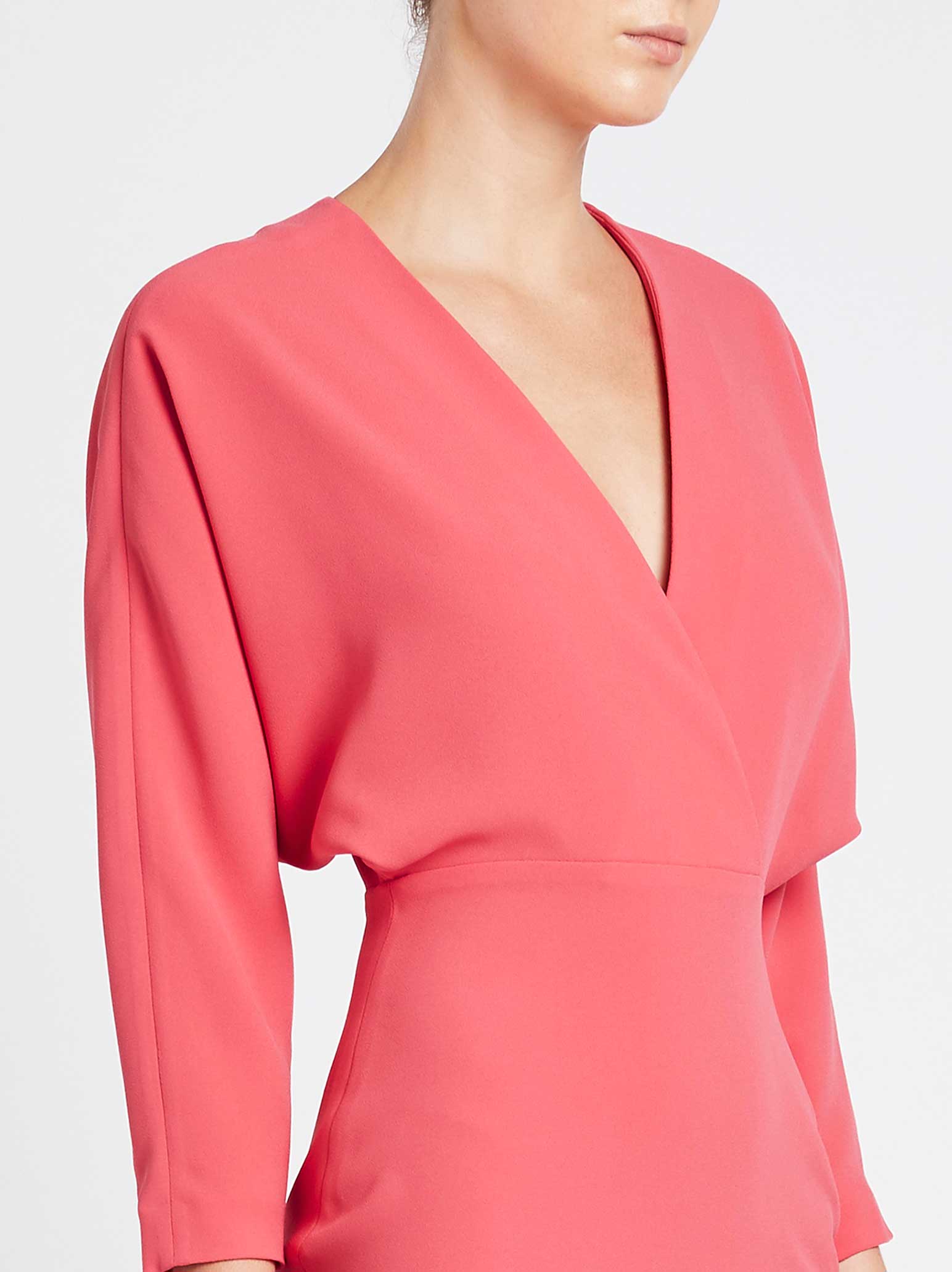 Step it up a notch in the IRO Detina Dress in Hot Coral. This dress is daring - a daring deep v neckline, daring silhouette, and double-daring colour. With a feminine silhouette and bat sleeves, the IRO Detina Dress stands out for all the right reasons.