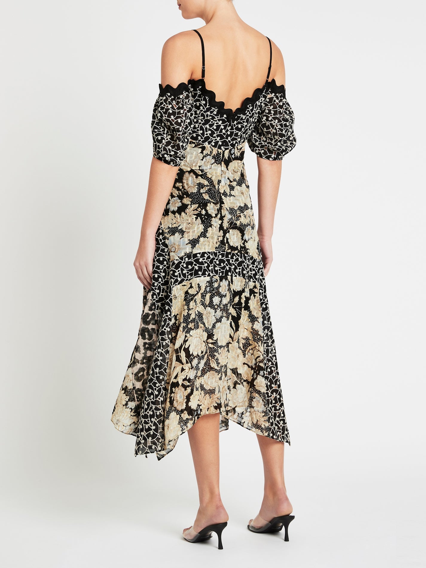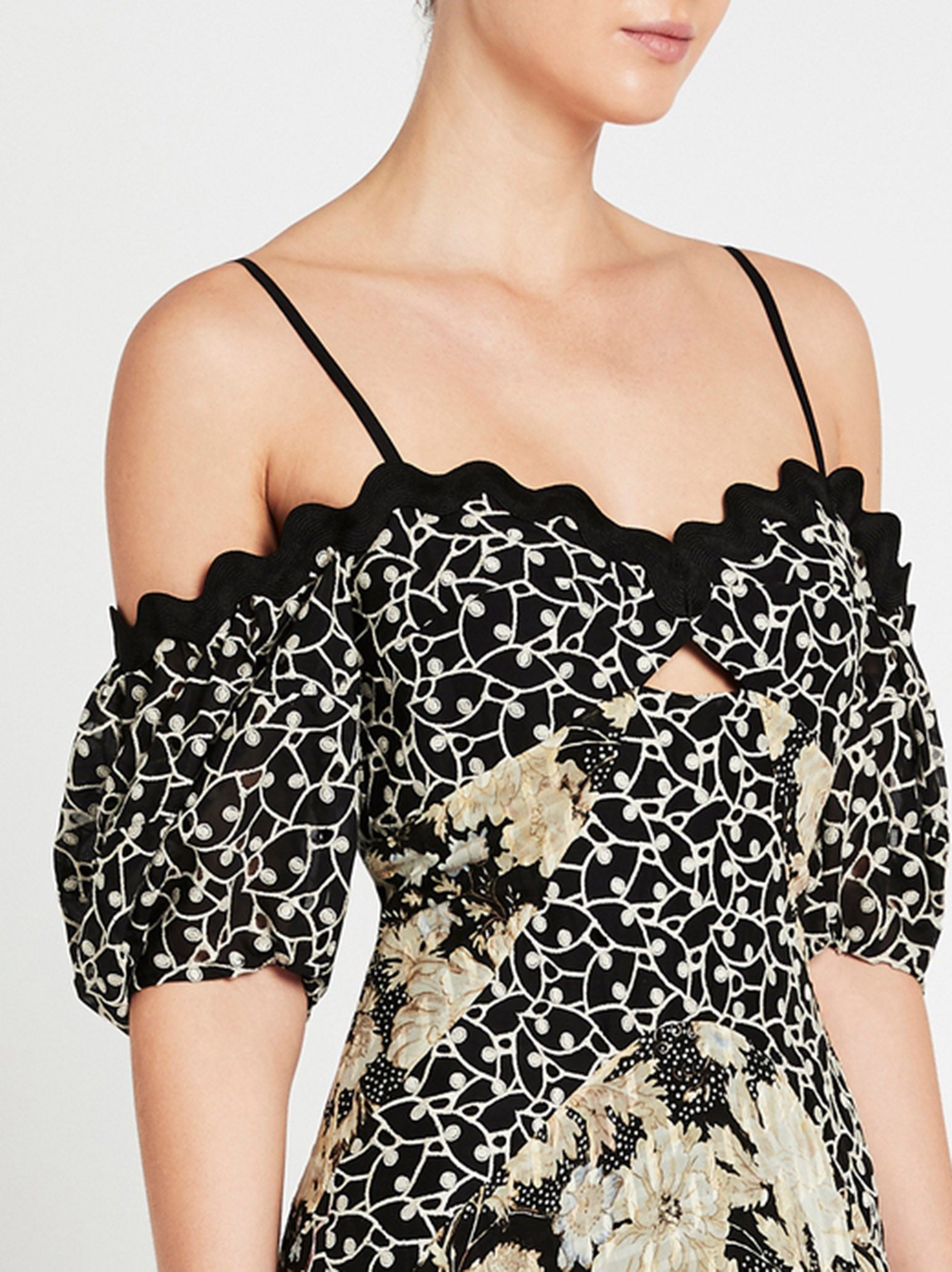 Rebecca Taylor delivers with a modern take on classic garden leaf print with the Mixed Print Off Shoulder Dress in Black Combo. Constructed from an ultra soft cotton blend, this off-the-shoulder midi dress features a scalloped neckline with a vine embroidery bodice and peak-a-boo eyelet and is finished with thin spaghetti straps with a centre back invisible zip closer. Pair with your summer sandals for the ultimate garden party envy.