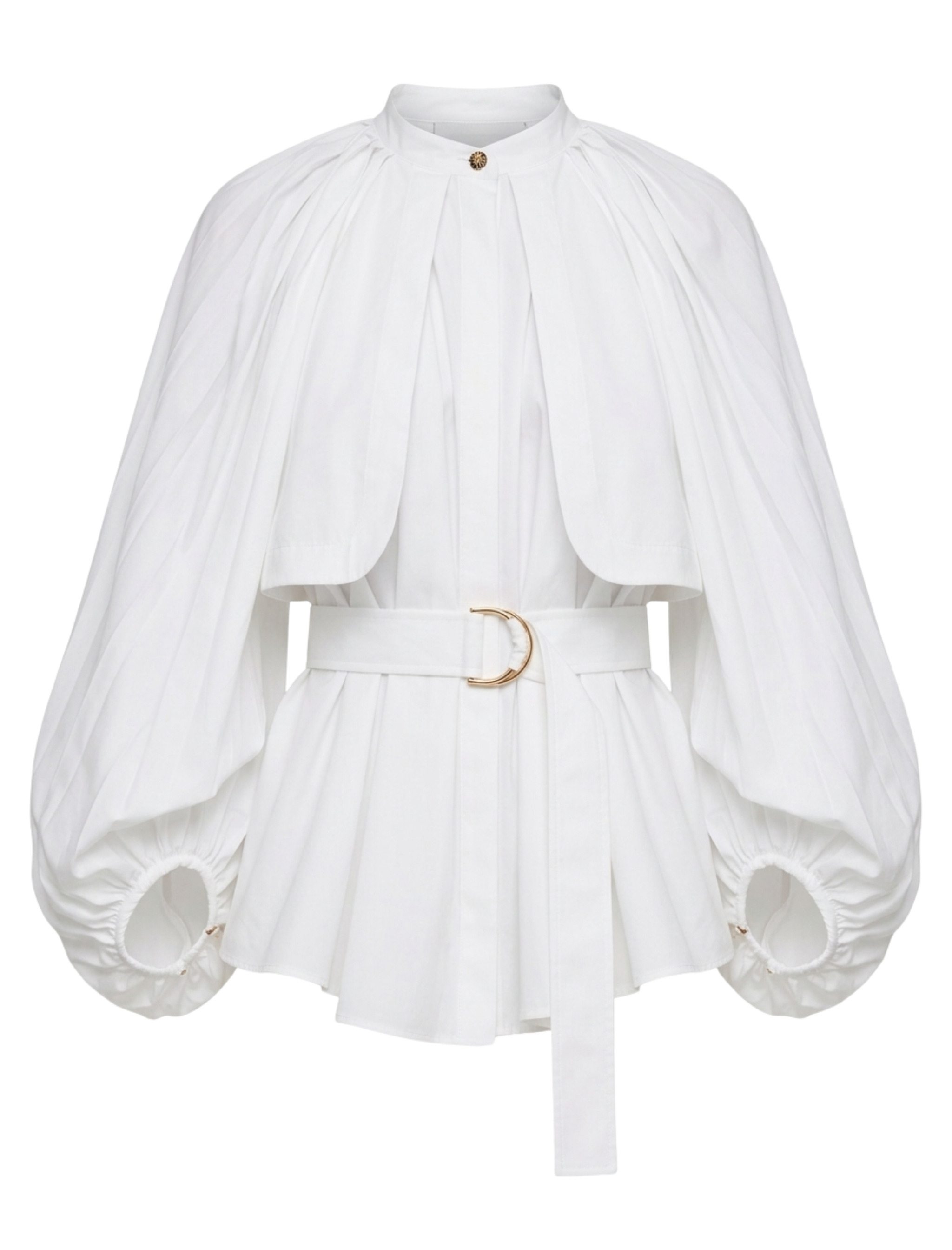 The architecturally inspired Ivy Shirt from Adelaide based design house Acler is a artful re-invention of a classic white shirt. Made from a crisp linen blend fabrication, the shirt has a charming pleated balloon style bracelet length sleeves, a priest's collar with gold button detail and loose lapel panels that create a layer of sculpture. The shirt is completed with an adjustable belt to cinch the waist in. Signature pleating adds texture to this elevated style.