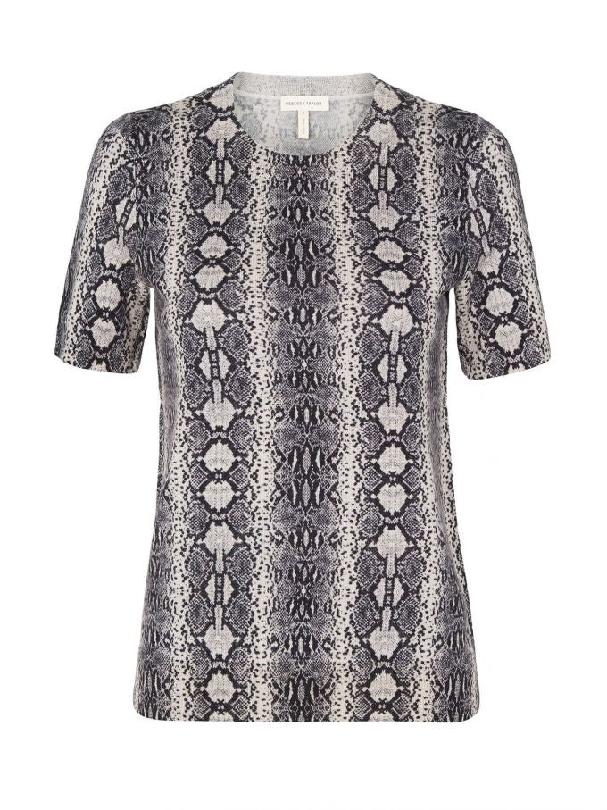 The Rebecca Taylor Short Sleeved Snake Print Pullover is a fine knitted top. The slim fit crew neck knit features an exotic snake print in pink and grey with a rib finish at the neckline, cuffs & hem.