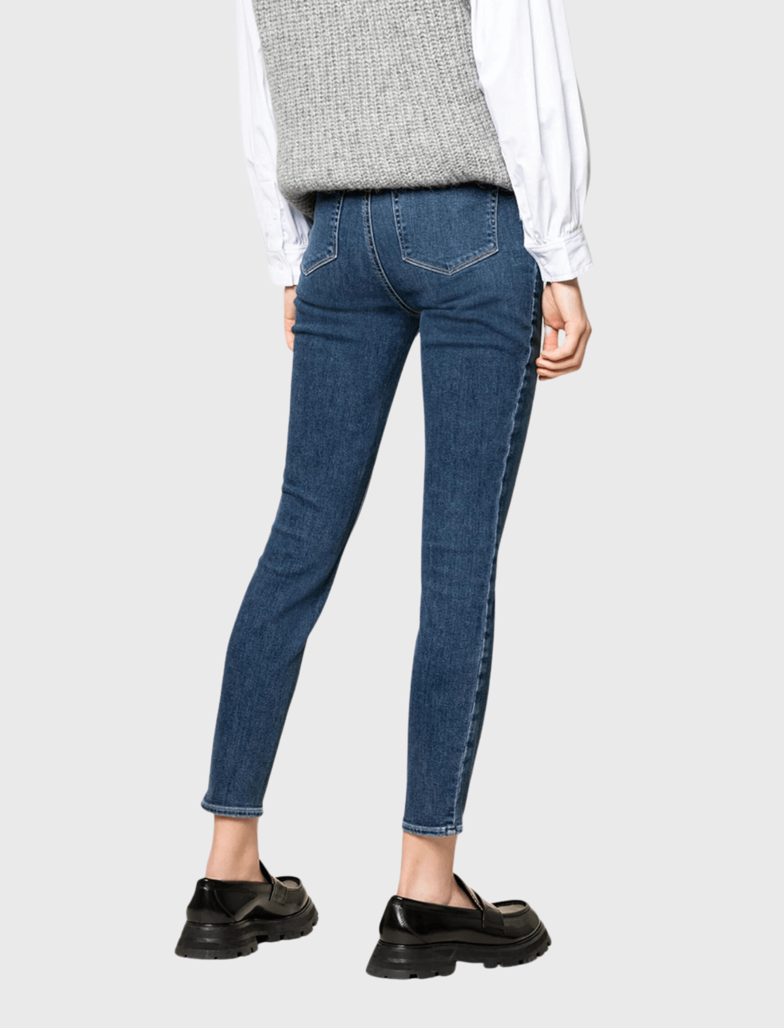 This is the Paige Margot Jean in the captivating middle toned indigo hue - Clique. This beloved classic is making a comeback for the cooler months. Embrace the high-rise, skinny leg design with an ankle-length crop that exudes timeless elegance.
