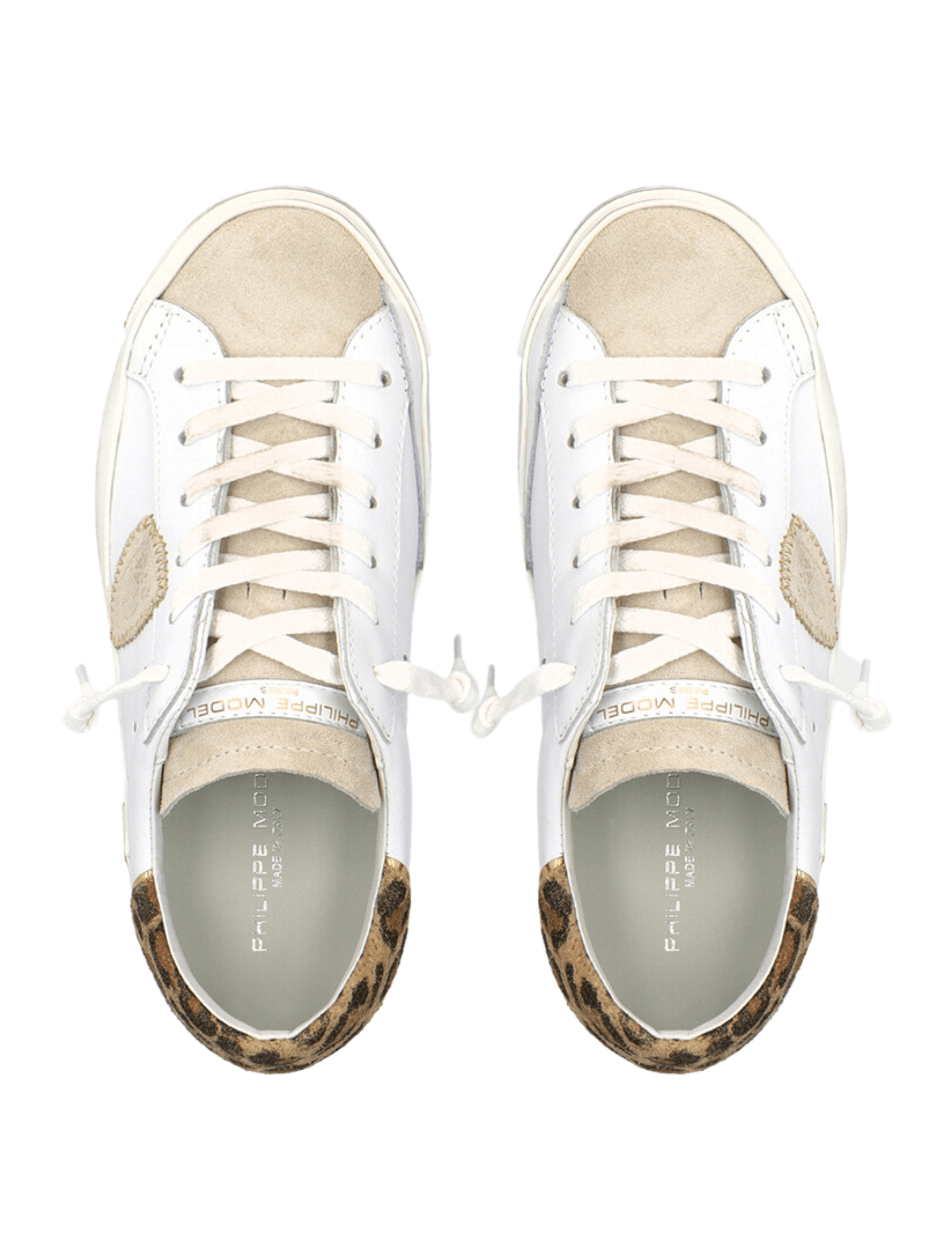 The Philippe Model PRSX Low Sneaker in Leo Blanc Brun (Leopard White Brown) is made from a Leather Upper, Leather Inner and Rubber Sole