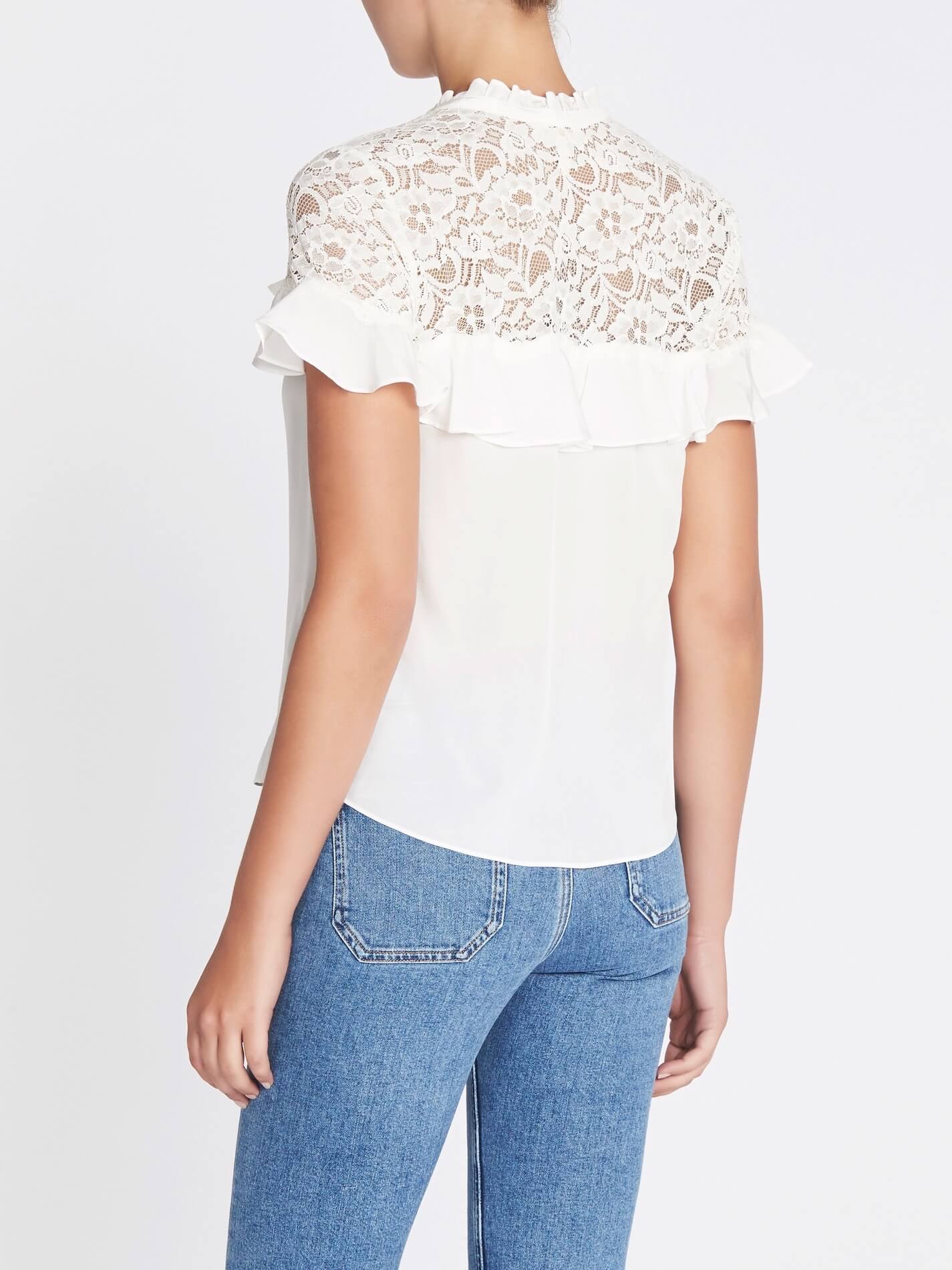 The Rebecca Taylor Silk and Lace Ruffle Top in Snow is true to size