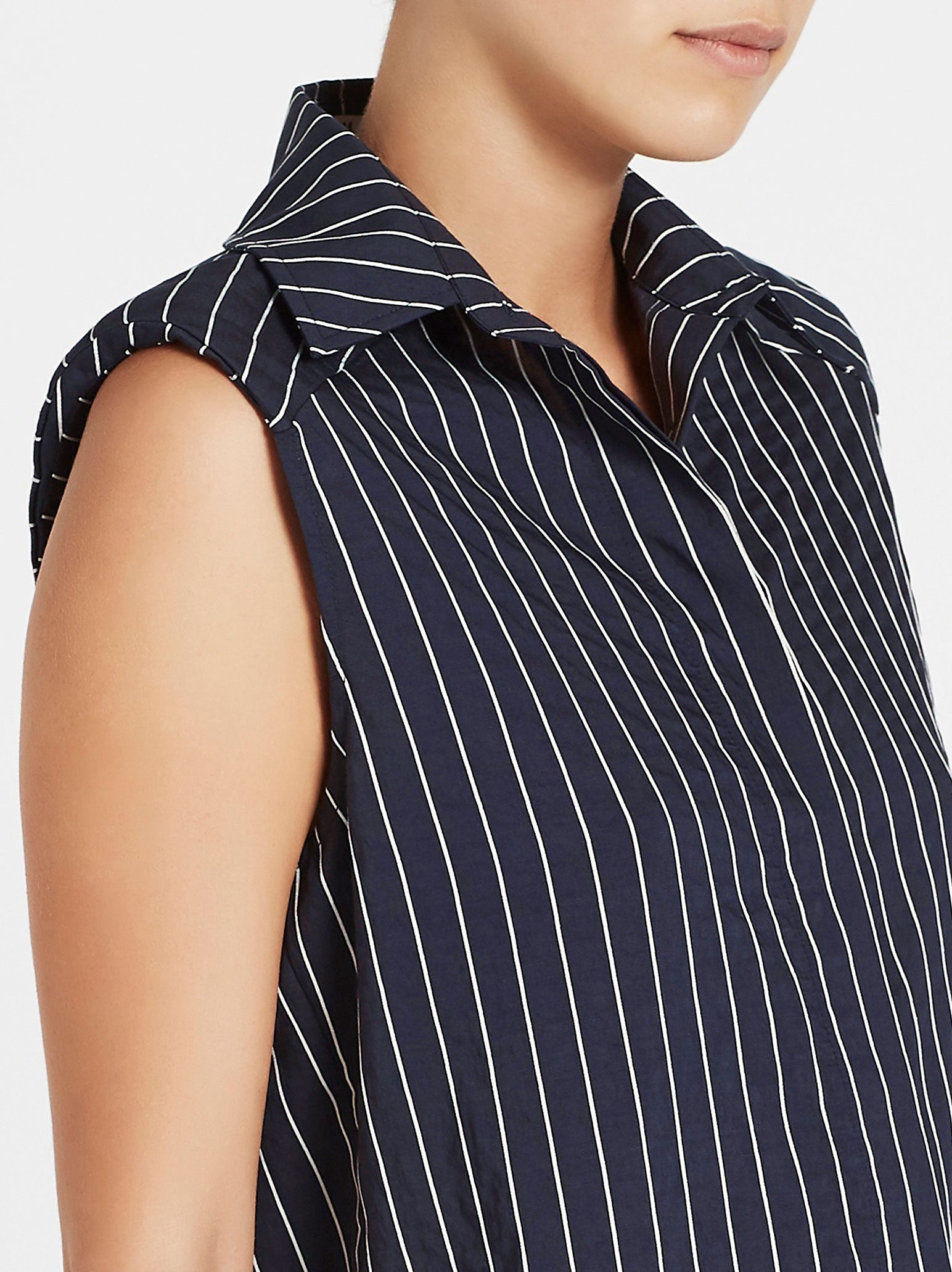 The Camilla and Marc Pollino Stripe Sleeveless Shirt in Navy & White Stripe fits true to size