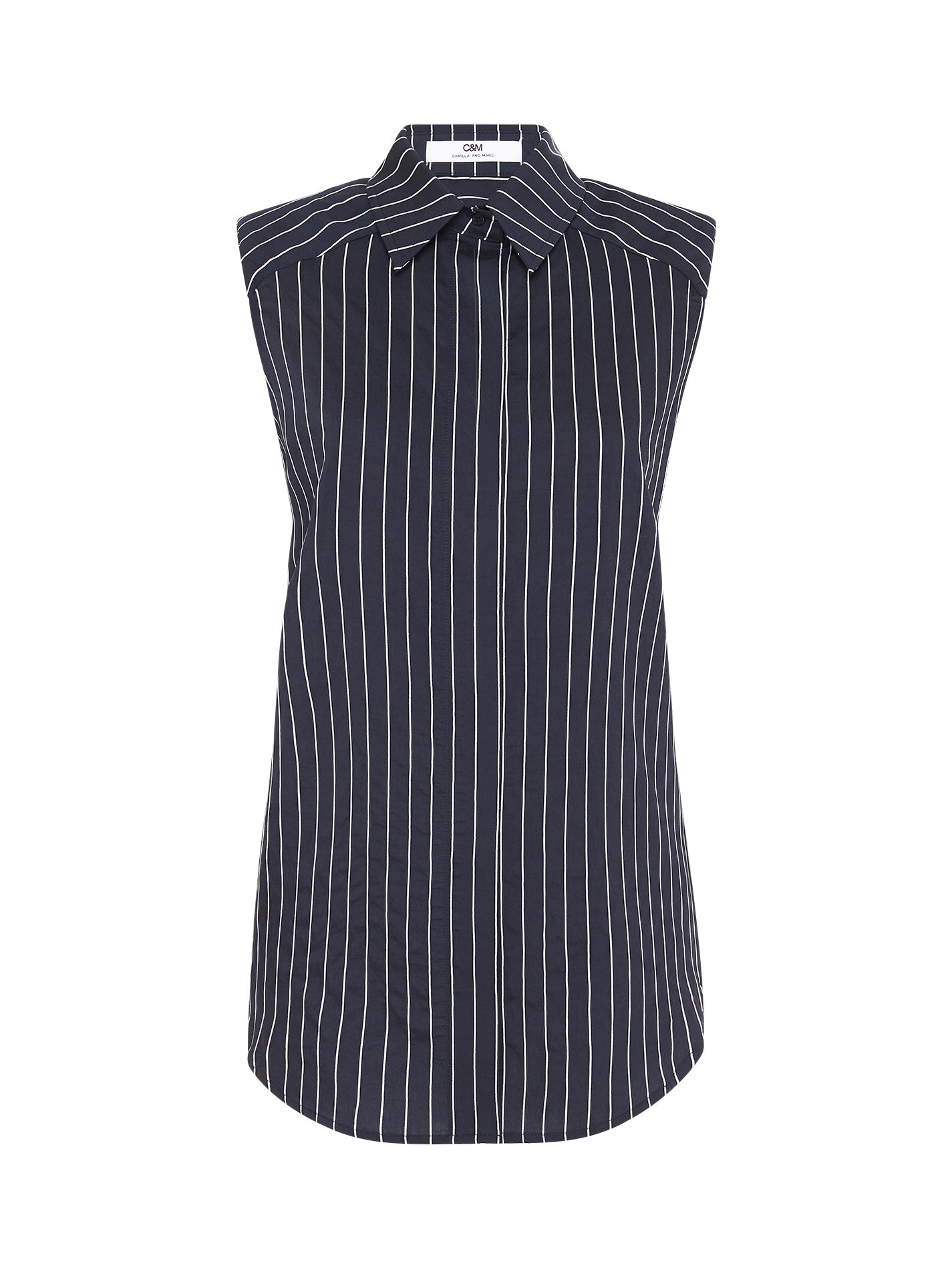 The Camilla and Marc Pollino Stripe Sleeveless Shirt in Navy & White Stripe is made from 65% Rayon, 20% Polyester and 15% Spandex