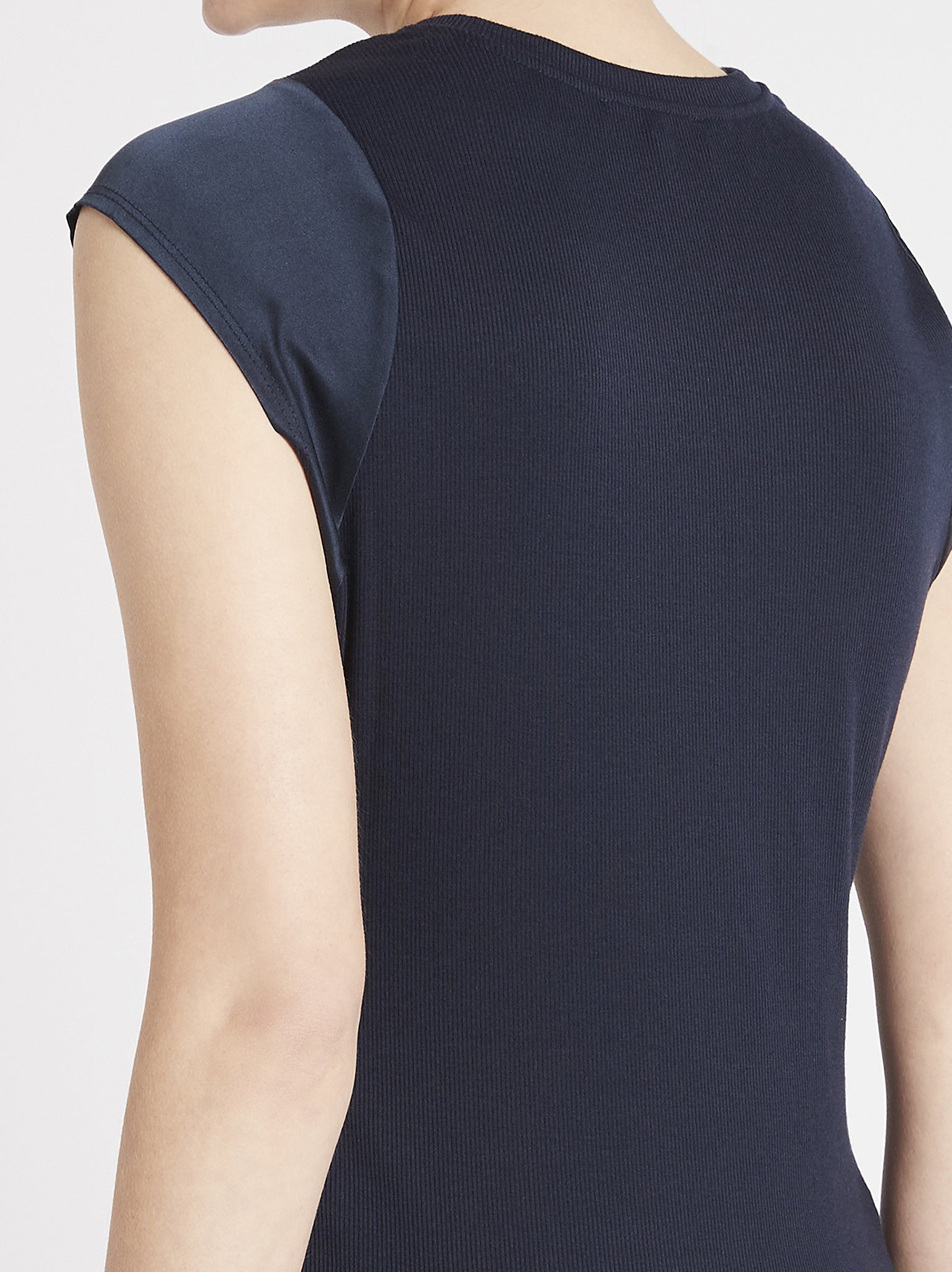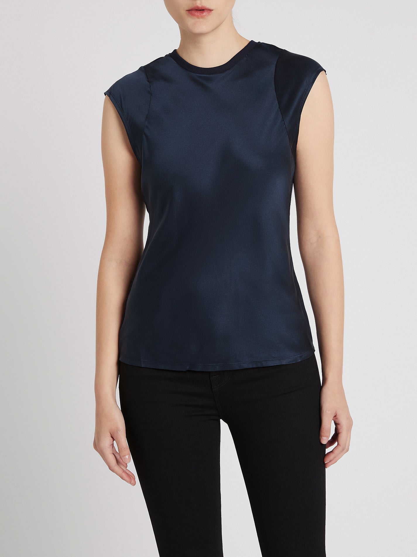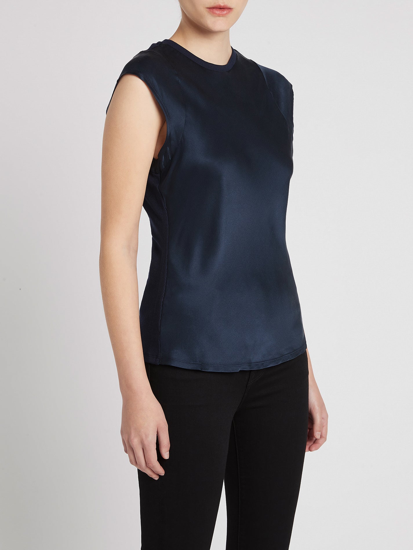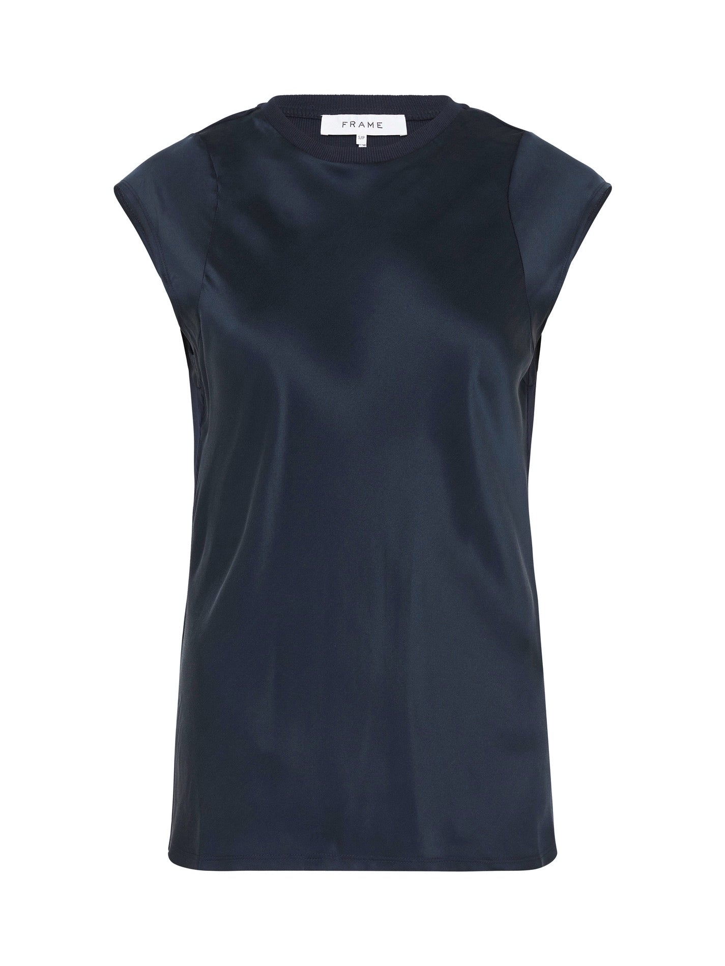 Take your basics up a notch with the Frame Denim Frayed Sleeveless Top in Navy. Constructed from a silk front with a rib knit crew neck and back, and frayed silk detailing, this must have piece combines luxe and leisure for the perfect tank your wardrobe needs. 100% Machine washable, the new wash and go silk makes luxury easy and sustainable. Just rinse and repeat. It is Bluesign certified, uses no gross chemicals or dyes and being 100% machine washable it prevents pollution from chemical cleaning. These lounge-worthy silk basics are made in factories that use less energy, reduce carbon emissions, and help regenerate the planet.