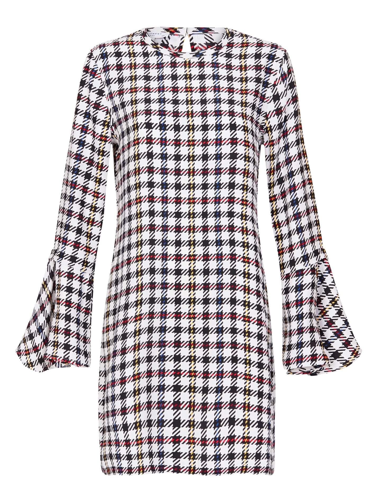 The loose fitting silk mini dress style from Equipment is sure to be a winner for these trans-seasonal months. Featuring a long sleeve withe a flutter cuff, the Mari Dress in Bright White Multi will look perfect with your best white boots.
