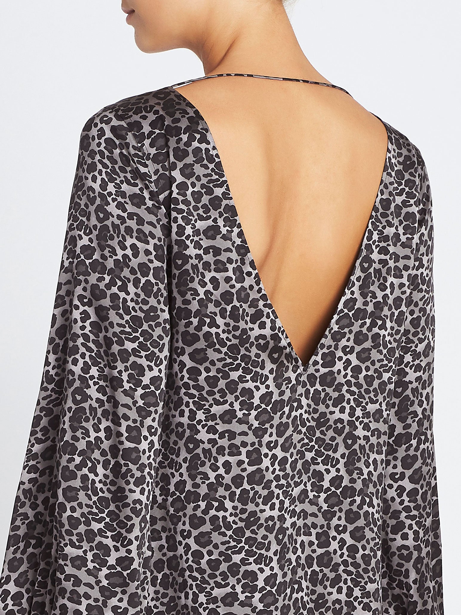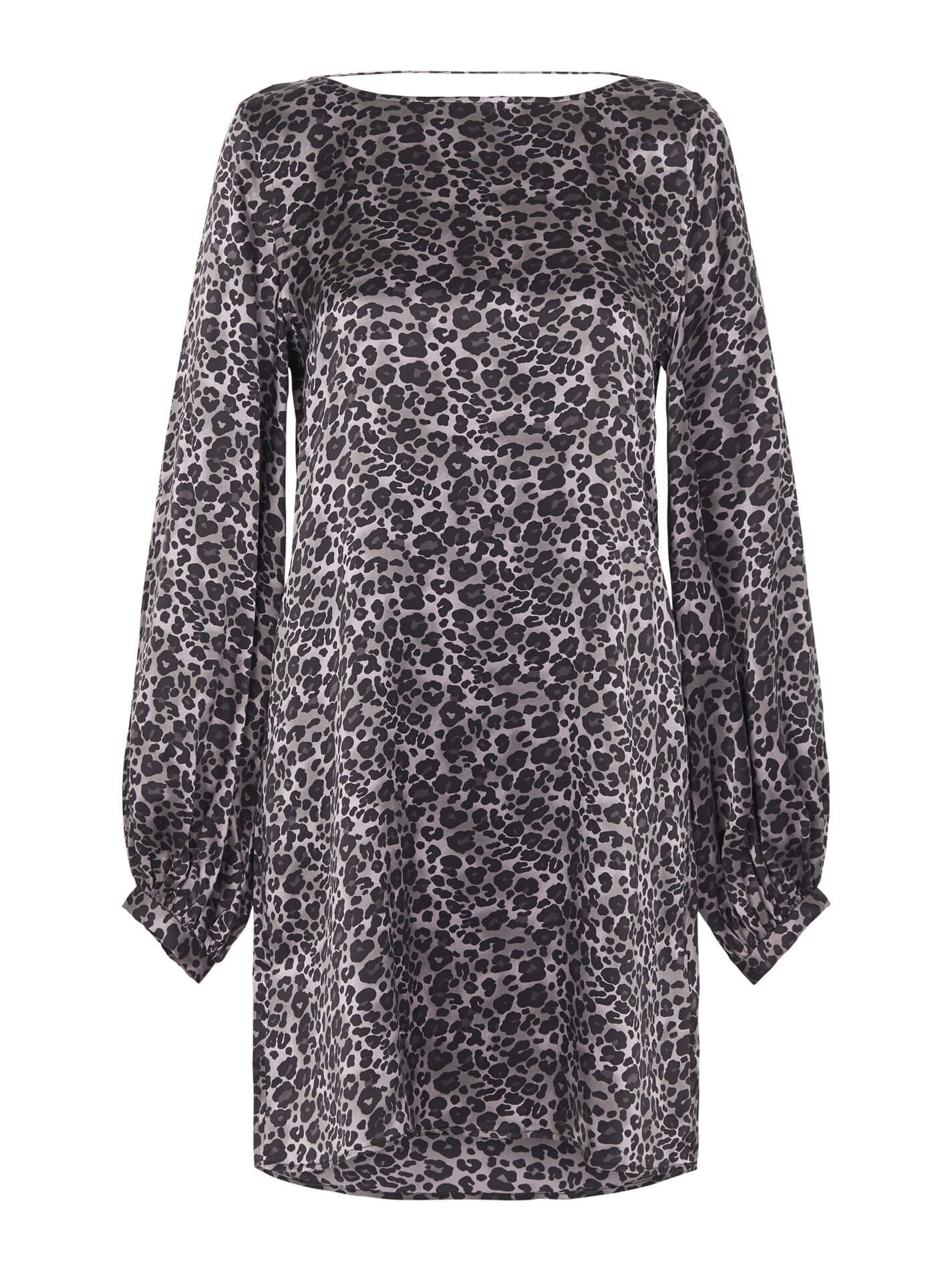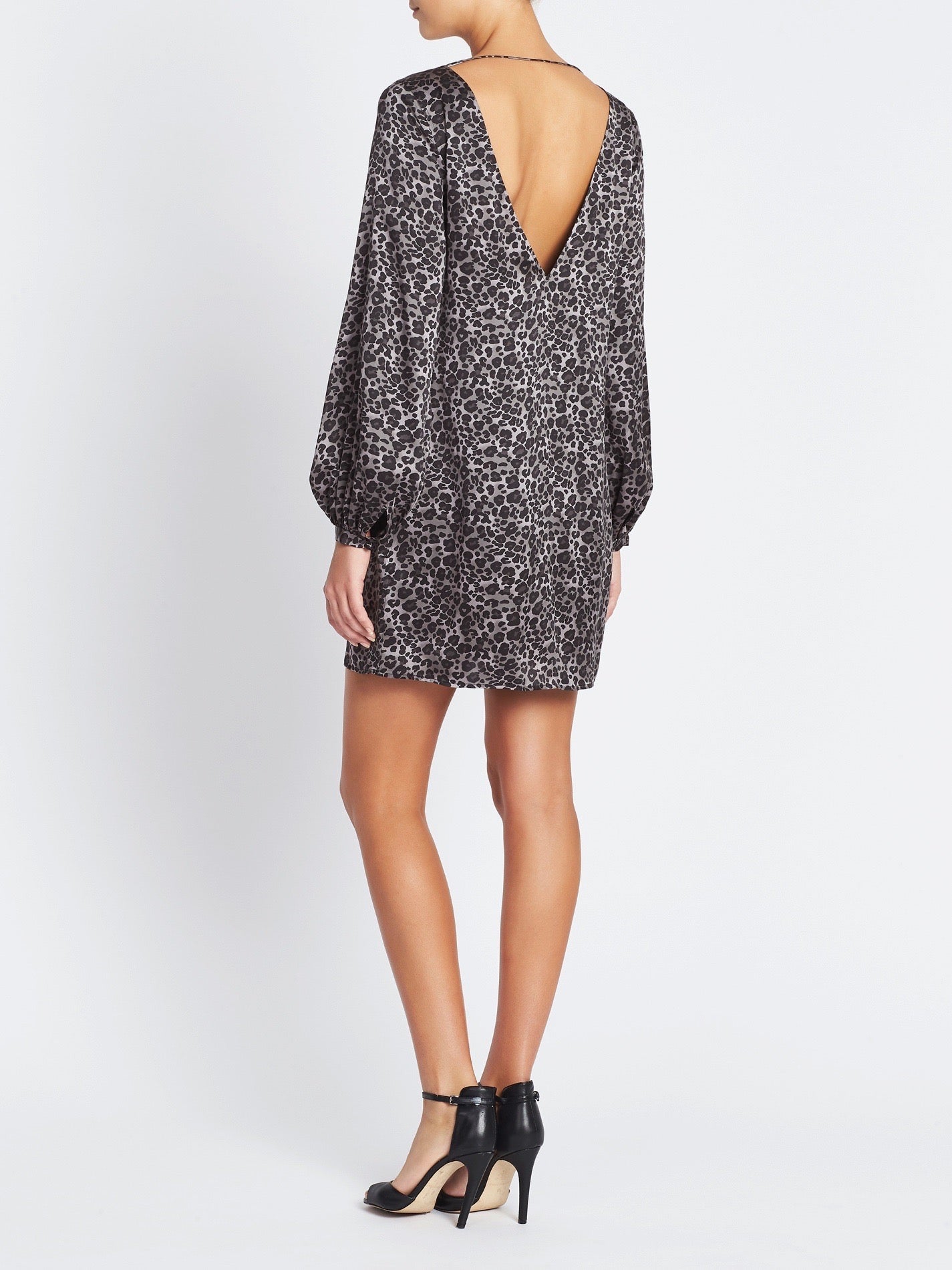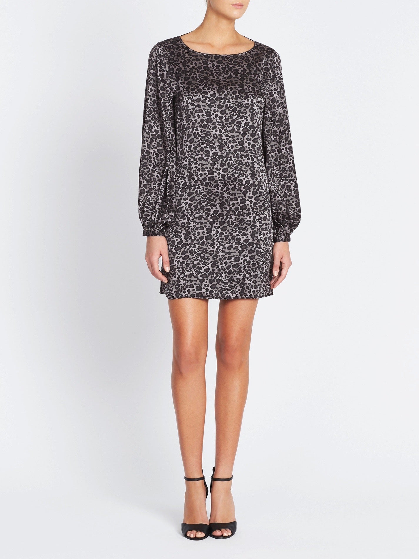 The Equipment Zipporah Short Dress in Silver Steel Multi is an easy to addition to any wardrobe. Constructed from an animal printed silk this lightweight mini dress features a round neckline, back v opening and long sleeves finished with subtle gathering at the single buttoned cuffs. Wear yours alone with your favourite strappy heels or layered over leather leggings and little black booties.