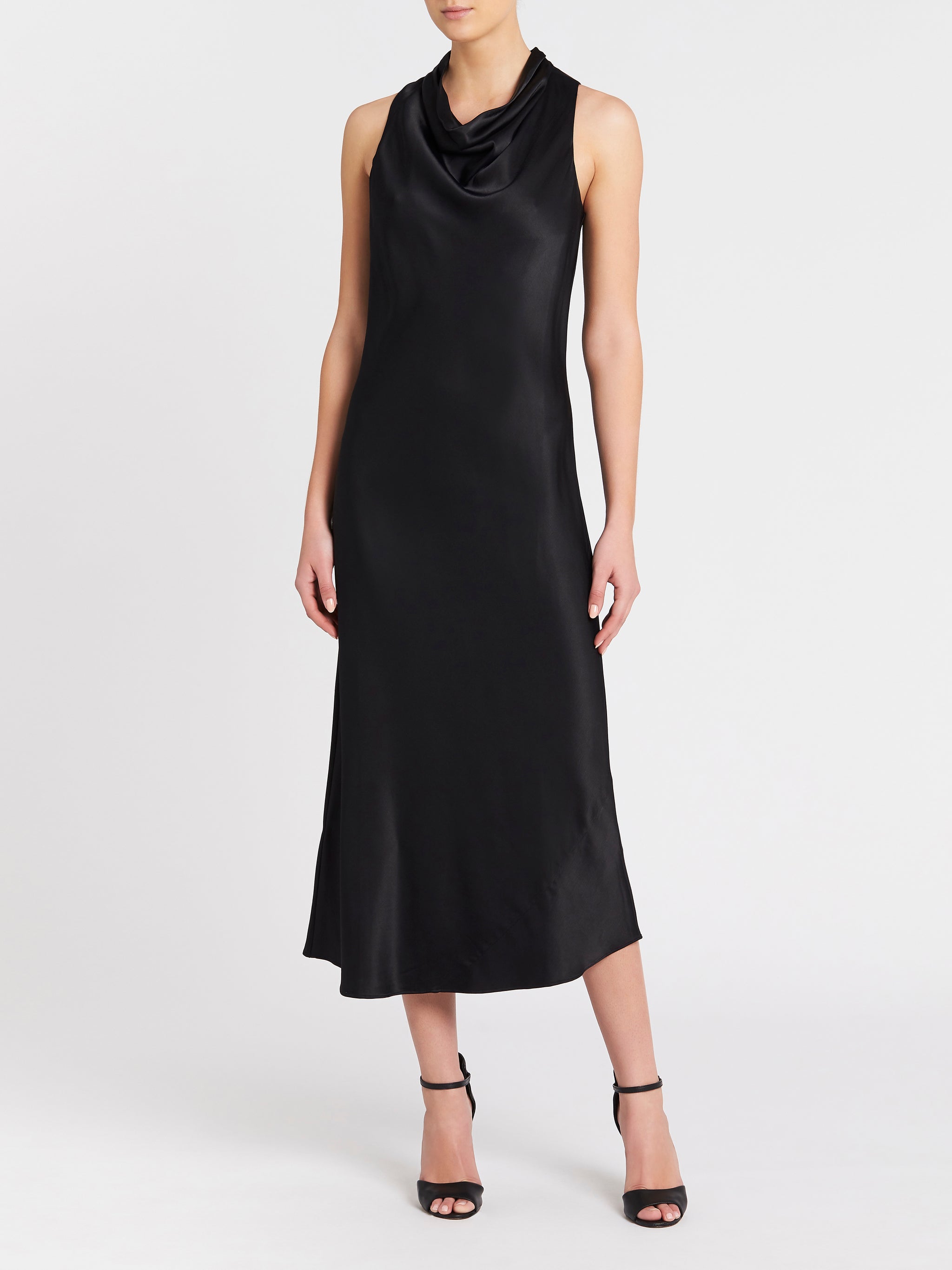 The Frame Denim Sleeveless Cowl Dress in Noir is made from 99% Viscose, 1% Elastane
