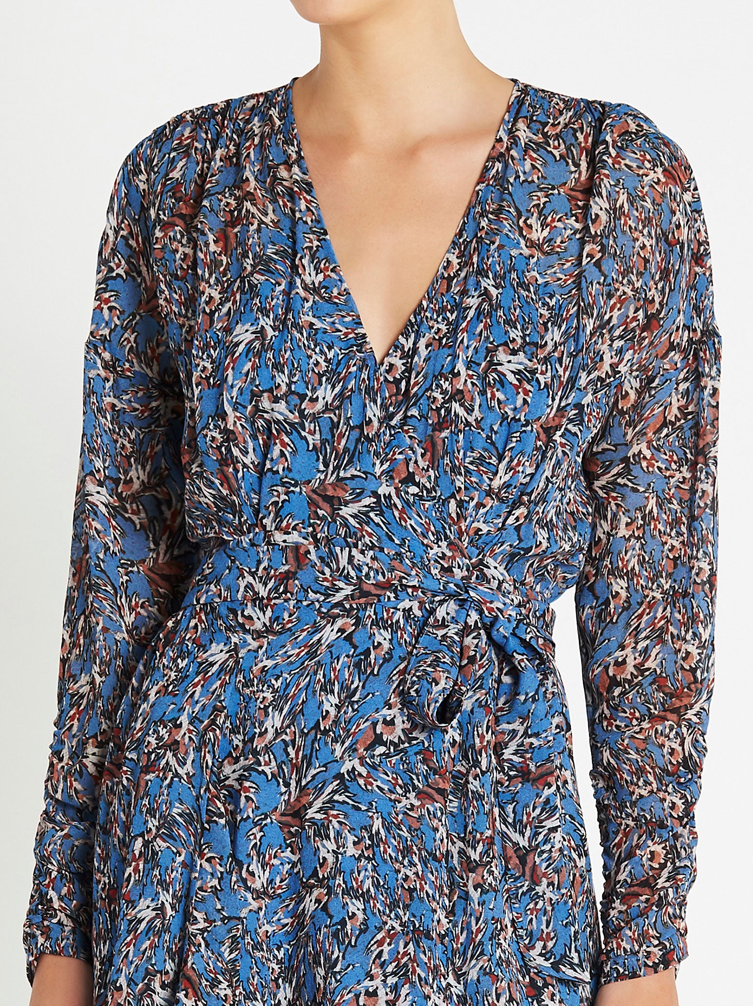 The IRO Bustle Mini Dress in Blue is sure to turn heads. This long sleeved gorgeous wrap dress is crafted from a semi-sheer crepe material and features a beautiful abstract floral print. The delicate ruffle trim and cuff details add a touch of femininity to the long-sleeved V-neck design.