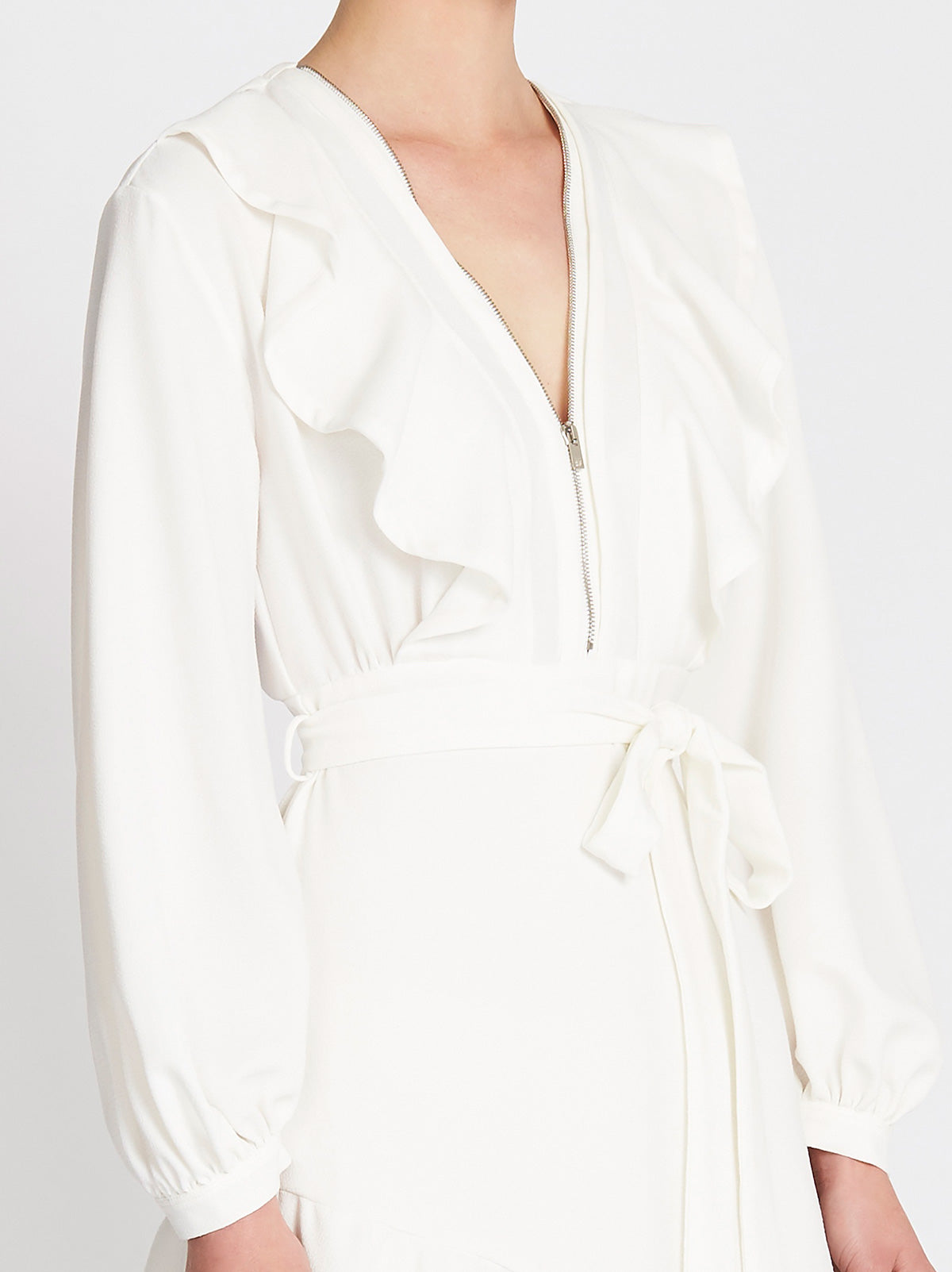 You could call it a dress with a lot of flair. The IRO Hopeful Dress is always ready for a good time! With long bell sleeves and ruffled detailing, you'll feel brighter than the Ecru color. A belt ties it all together and a silver zip adds a unique sparkle to the V-neckline. So hopefuly(ly) you know it's the dress for you!