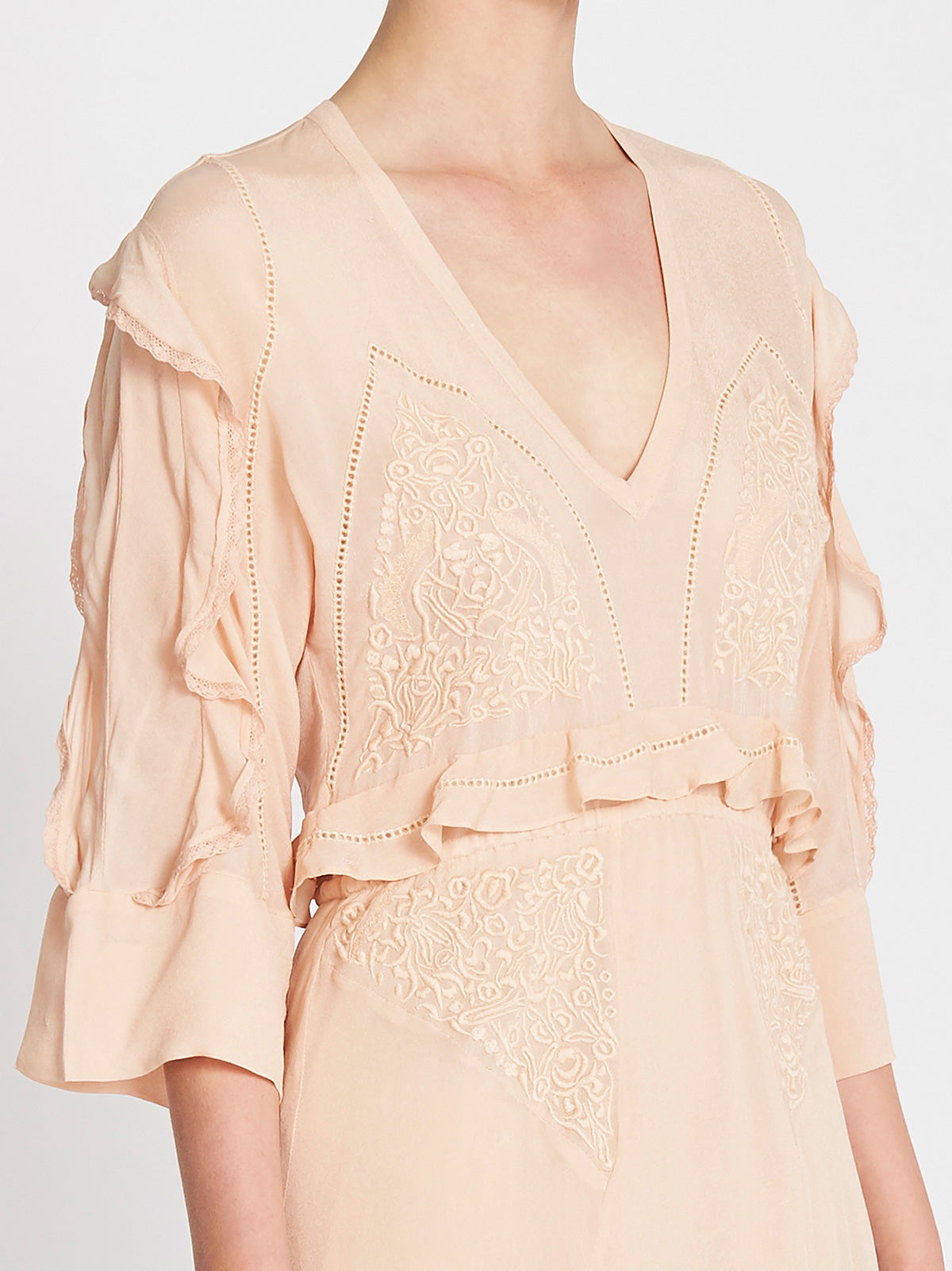 Indulge in ethereal beauty with IRO's Underco Dress in Old Pink. This captivating design embodies pure femininity, drawing attention to its delicately ruffled construction that cascades gracefully down the body.