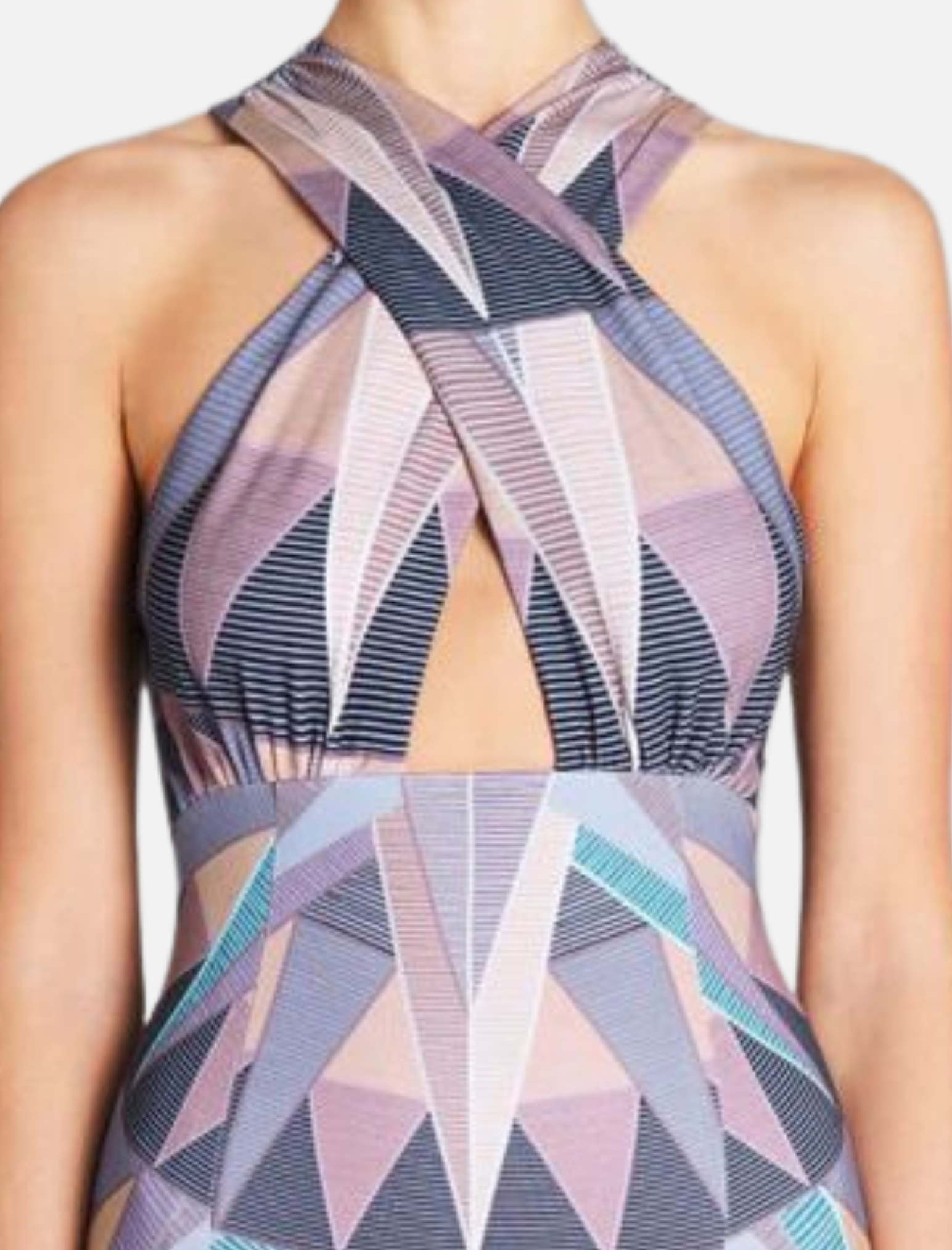 This midi dress by Mara Hoffman features a crossover front with a cutout. Designed with a digital print, this style has a fitted pencil silhouette.