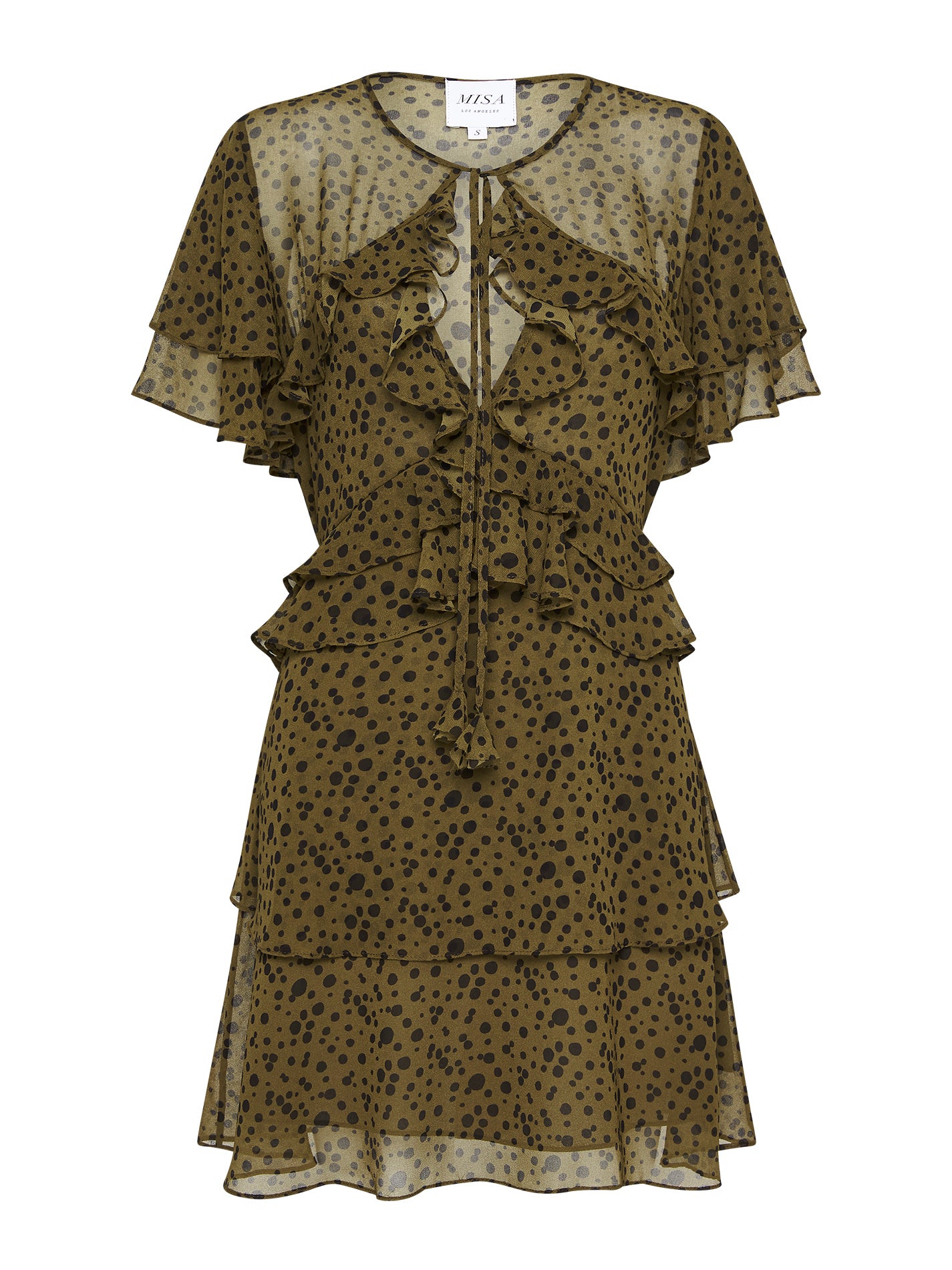 Step out in style in the MISA Los Angeles Ignacia Dress. Constructed from a polka dot printed moss green chiffon viscose this mini dress features a split v neckline with petal ties, soft ruffles along the bust and waist line and is finished with short tiered flutter sleeves and a tiered skirt. This piece is semi-sheer through the shoulder plackets and back while the rest of the dress is fully lined.