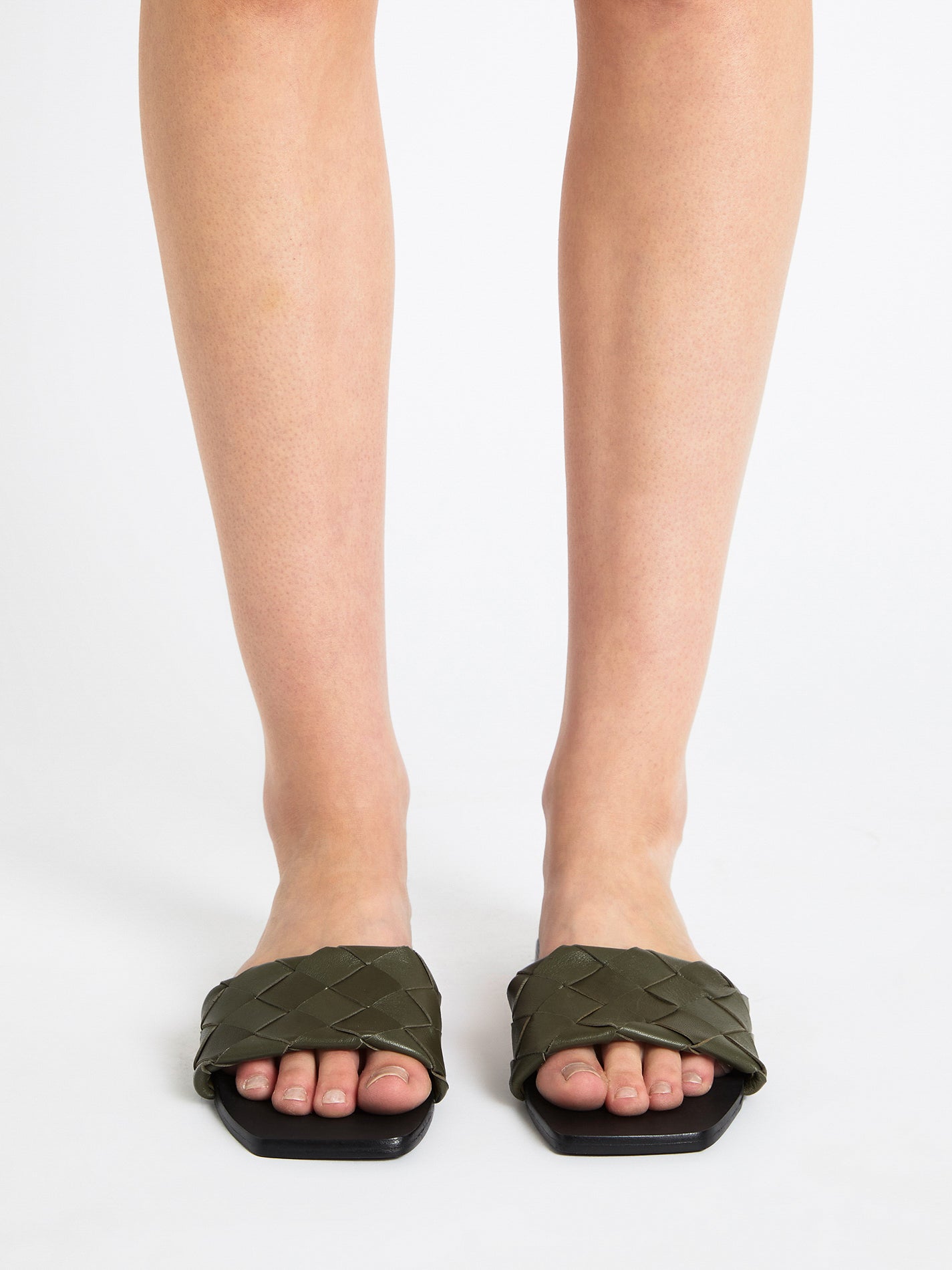 Keep it easy in the Sol Sana Sage Slide in Moss this summer. Constructed from leather, these relaxed styled slides feature an exaggerated basket weave detail and are finished with a strong square finished toe, making this elevated staple a summer must.