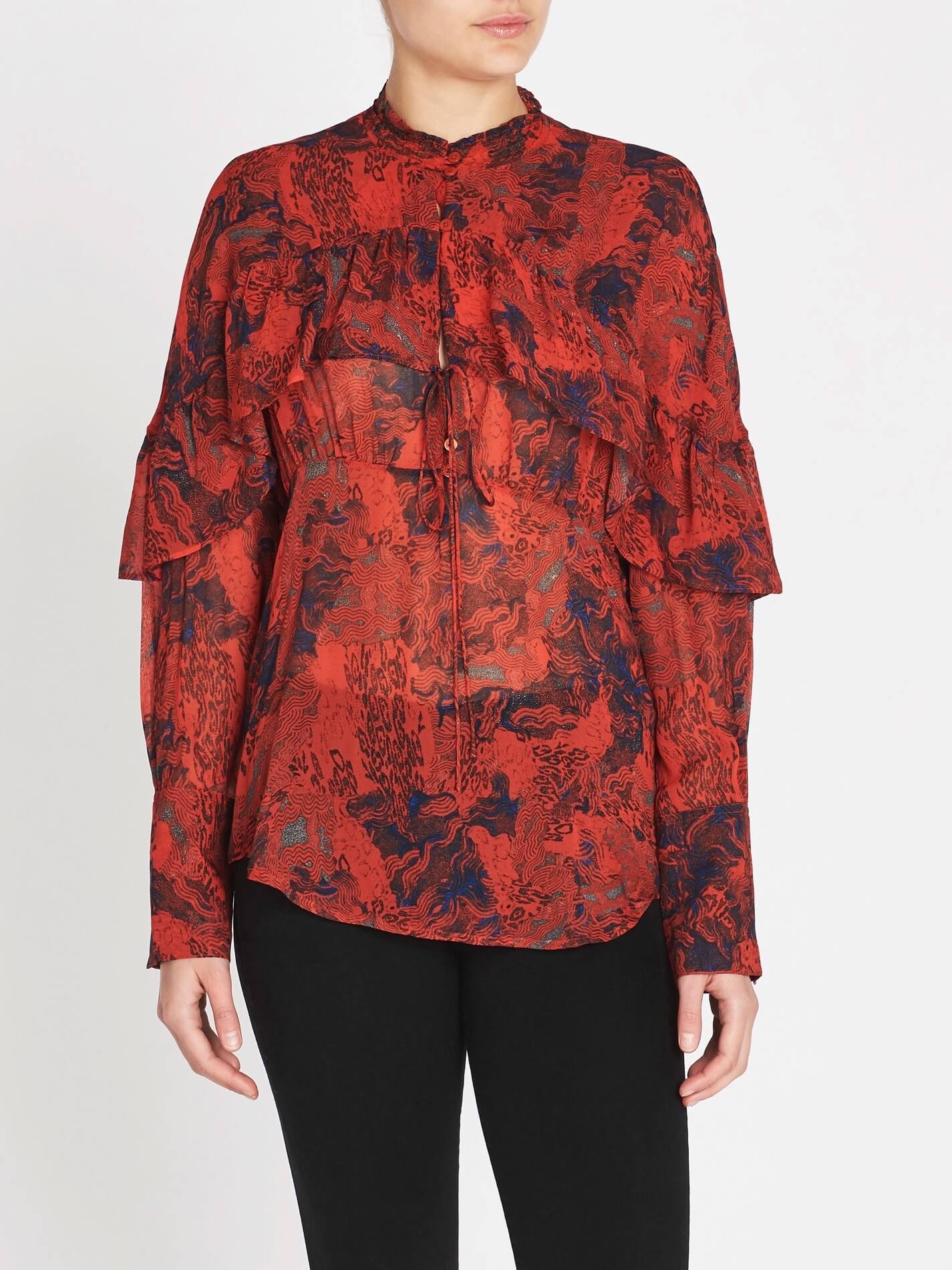 We love a good printed blouse and the Klara Shirt by IRO is no exception. Constructed in a red psychedelic print this long sleeve shirt features a round collar, front button closure, ruffle details, adjustable drawstring detailing and is finished with a curved hemline.