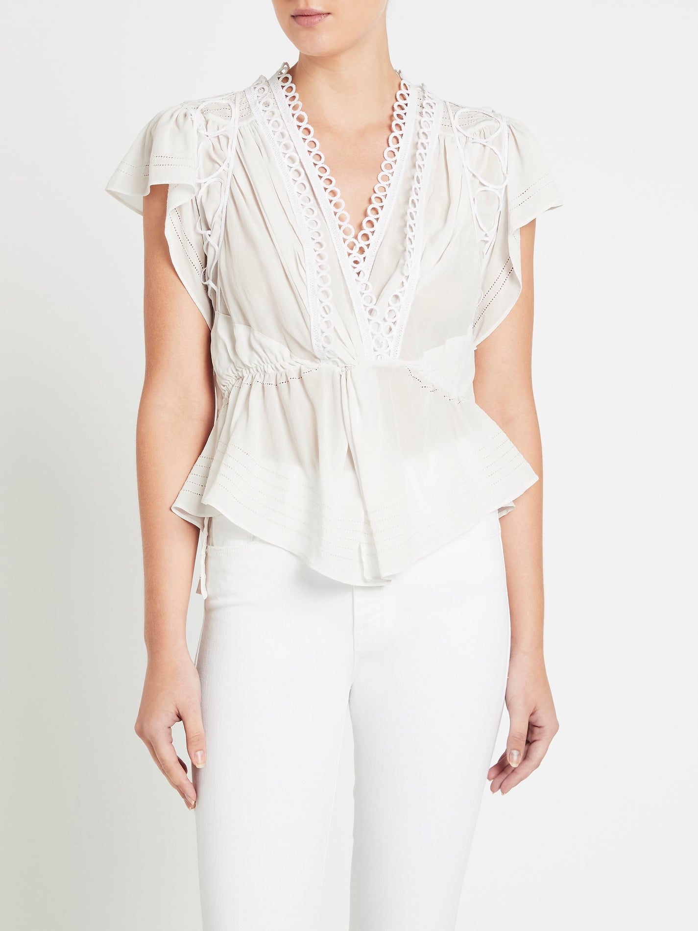Feel the fantasy in the IRO Mint Top in White. Made from 100% silk, this delicate top features lace paneling, a romantic V-shaped neckline, cap sleeves with a cascading ruffle, and a slightly-gathered waist. The Mint Top was made for your next romantic escape.