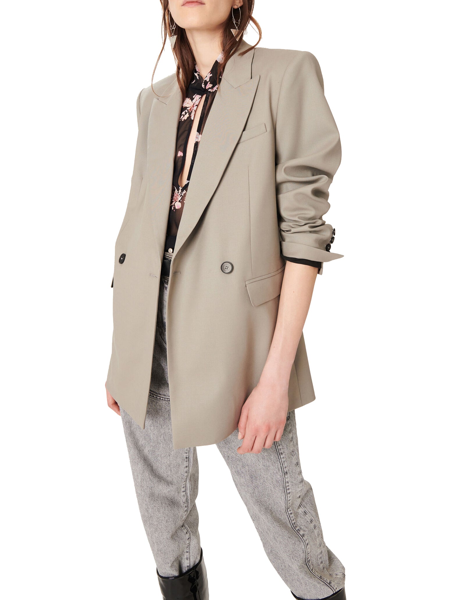 The IRO Flemi Jacket in Taupe is a oversized style, size down for a firmer fit