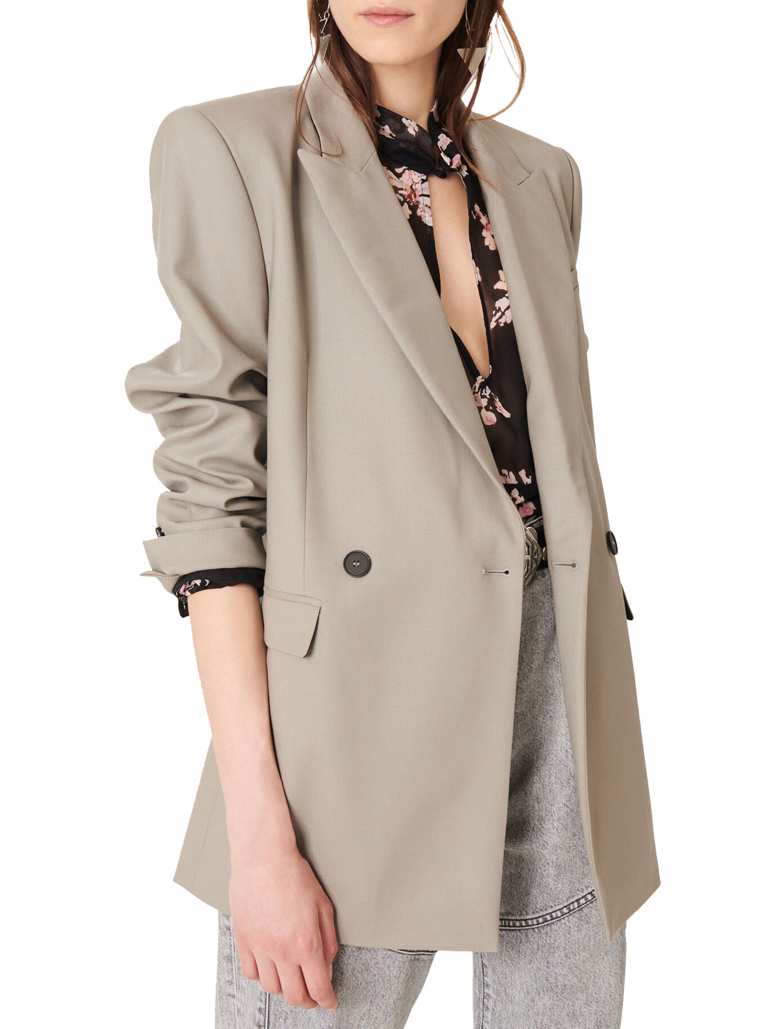 The IRO Flemi Jacket in Taupe is a menswear inspired piece with structured shoulders and clean lines to add to the timeless elegance of this blazer. This is a wardrobe staple to be styled over everything from dresses to jeans.