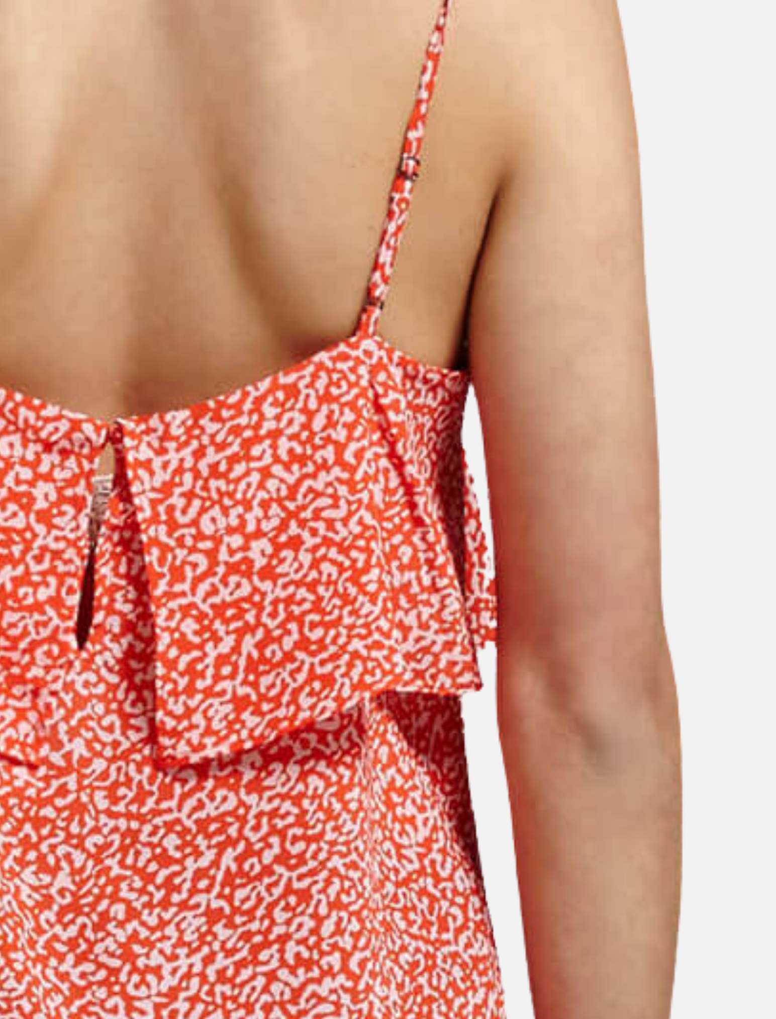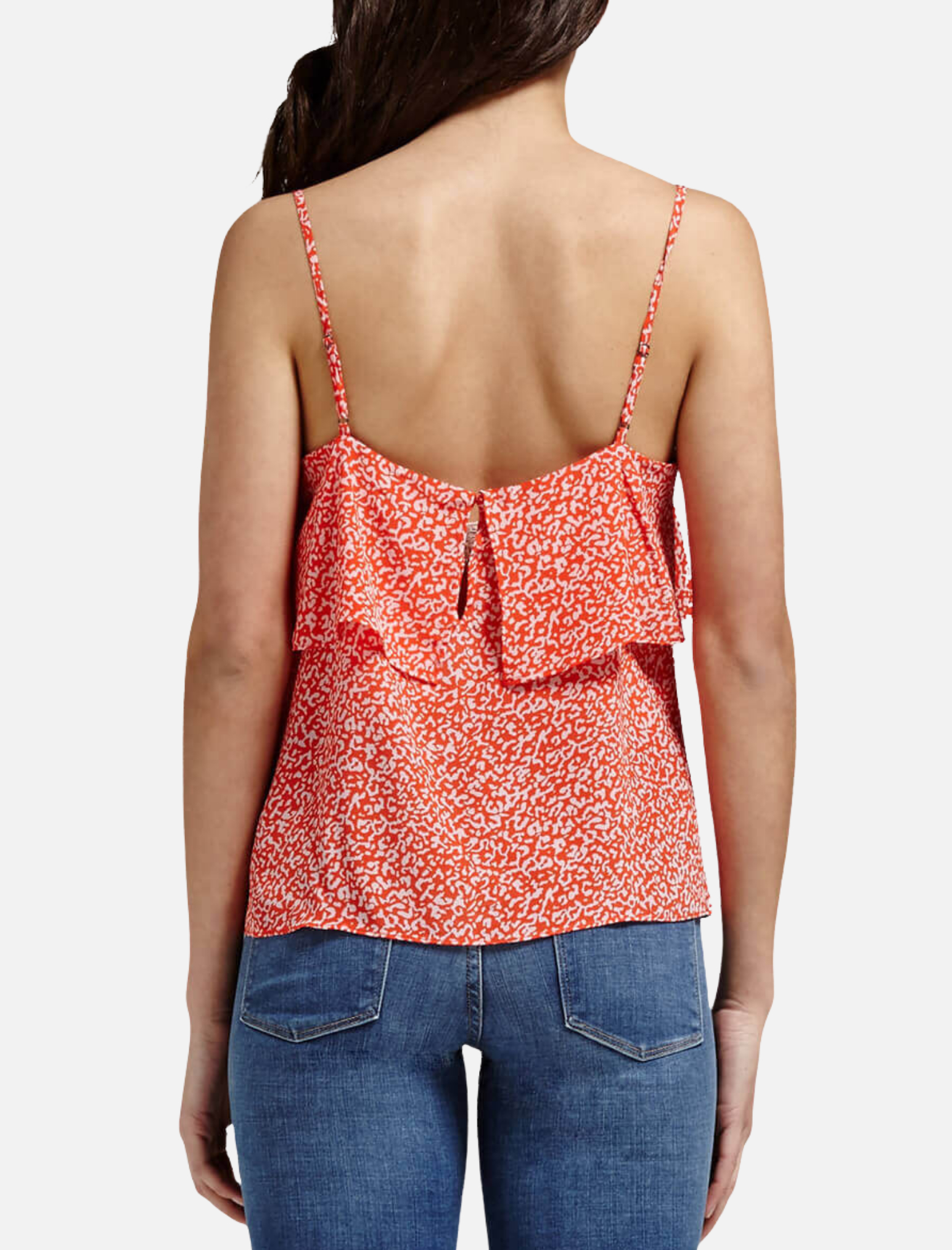 Joie's Odina Spot Print Cami is a soft silk top in a pink and red spotted pattern. This cami has a slight V neck, a frill layer, and features button closure, back keyhole detail and adjustable straps.
