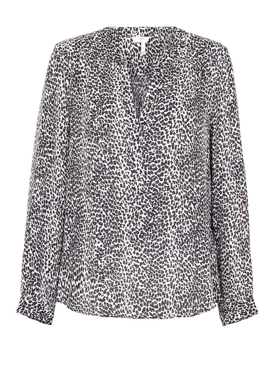 Indulge in the subtle allure of the Joie Carita blouse, where a delicate leopard print in shades of white and grey takes center stage. This elegant piece showcases a banded open split V neckline, adding a touch of sophistication to your ensemble. With long sleeves graced by button cuffs, this blouse seamlessly balances comfort and style.