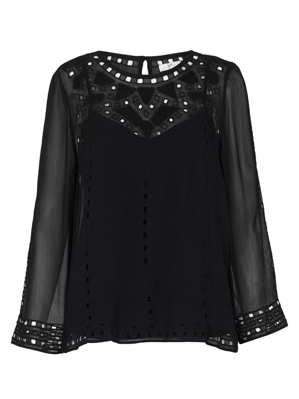 The Joie Gaiane Top is a delicately detailed black silk crepe blouse. The sheer, flowy silhouette is treated with stunning geometric embroidery, keyhole back closure and features bracelet length sleeves. Slip included.