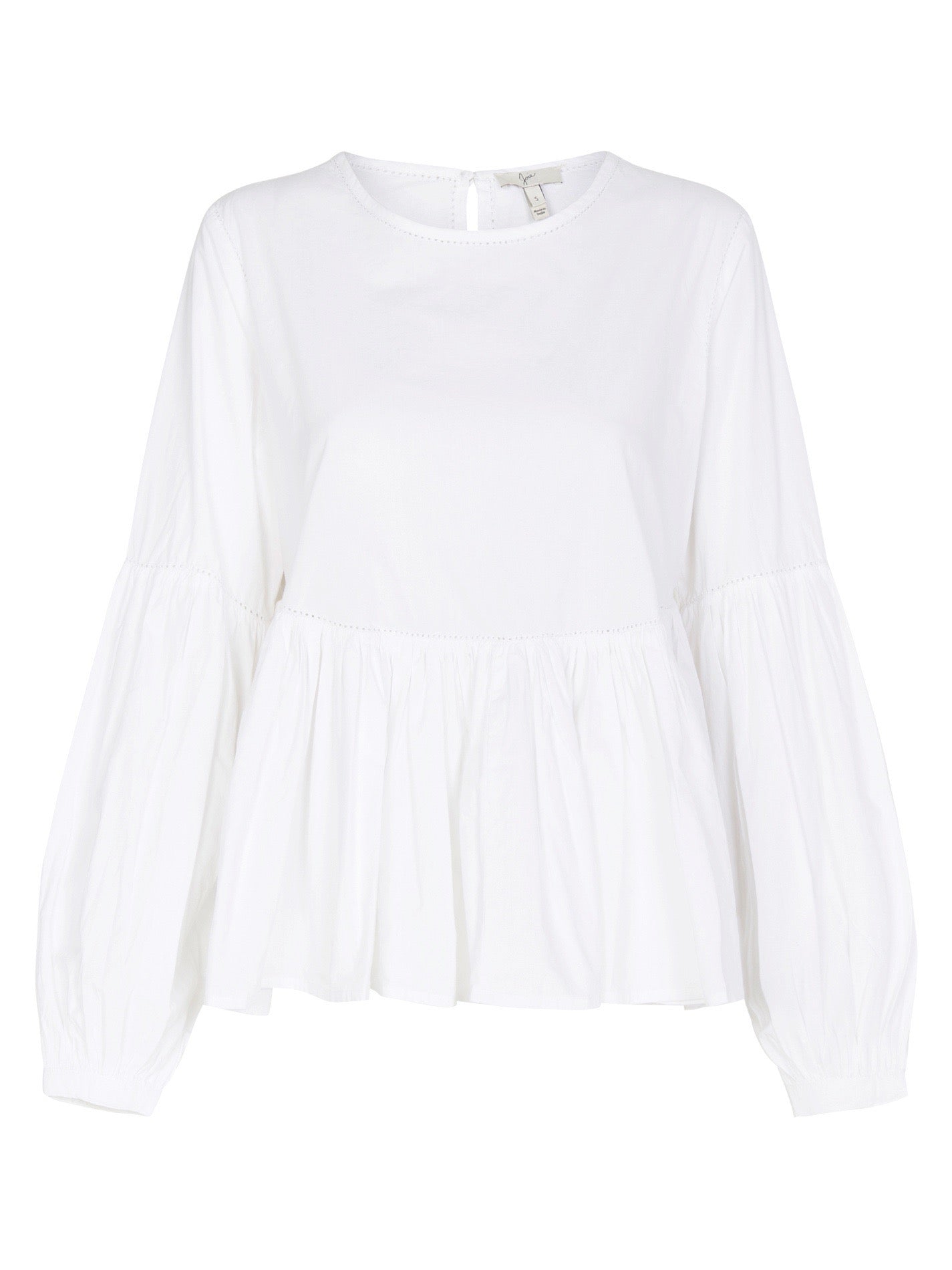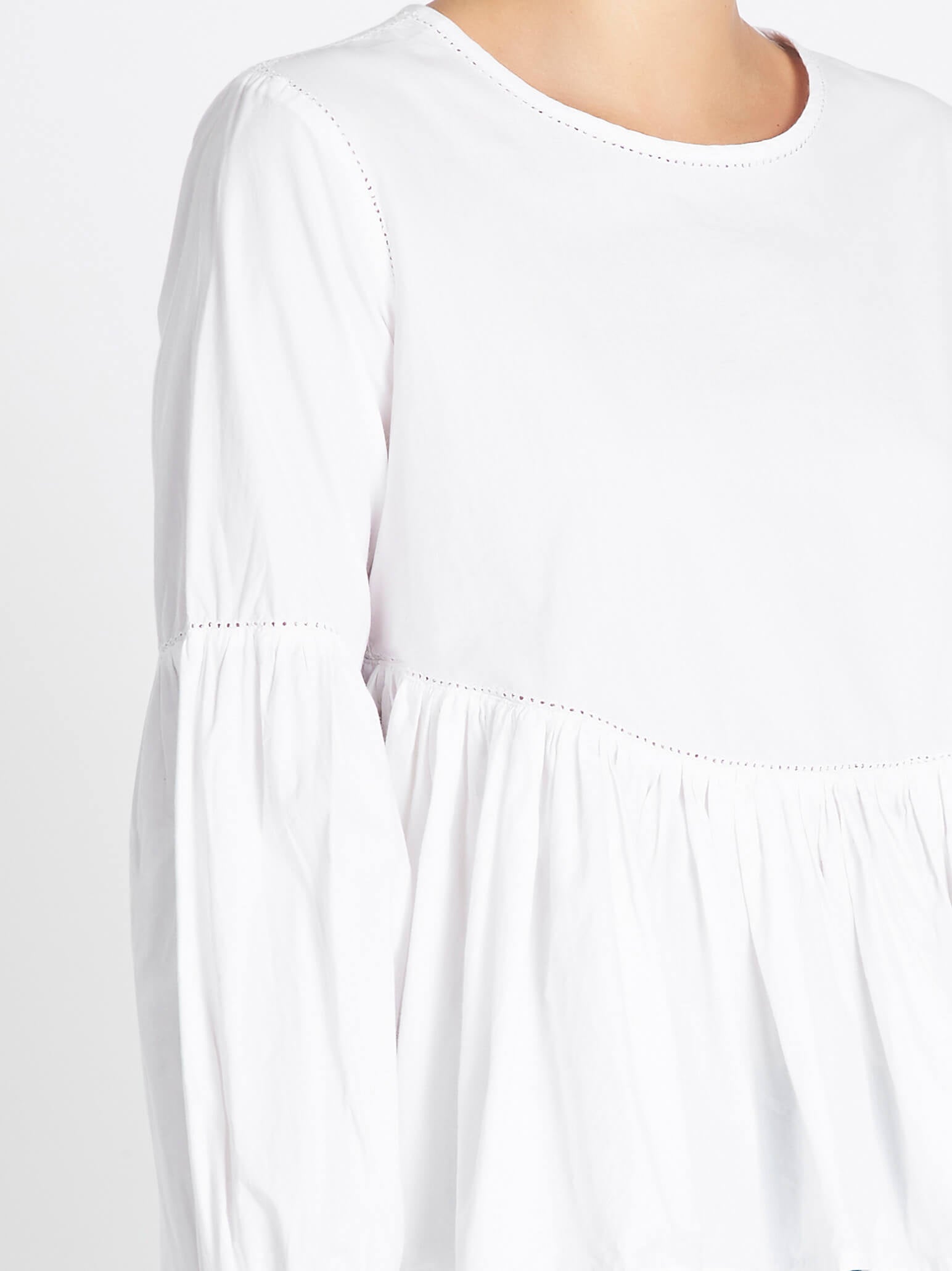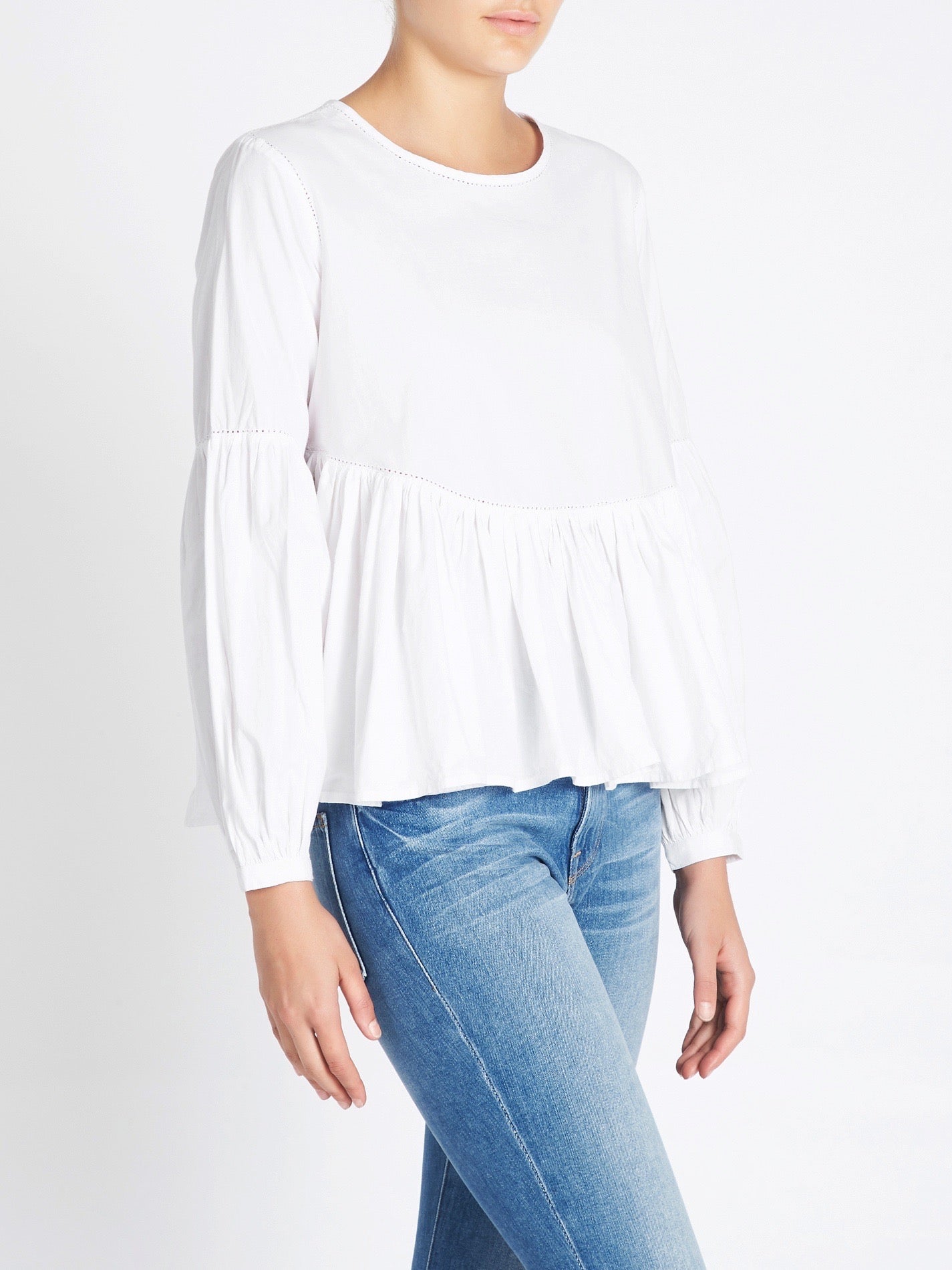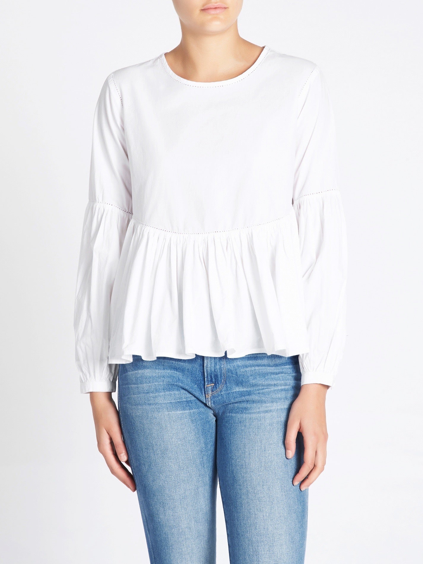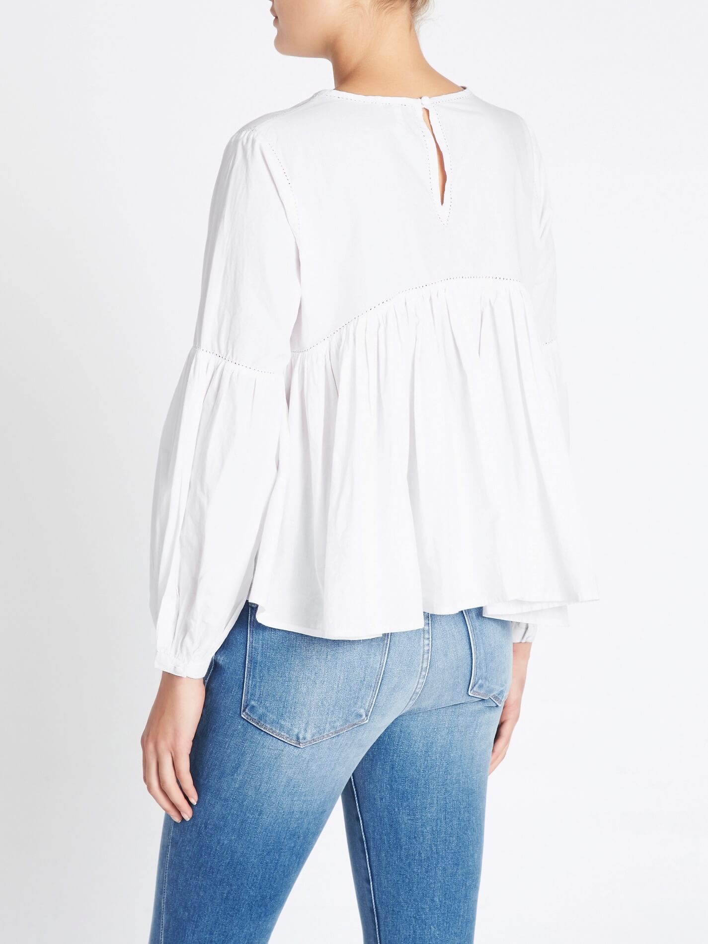 The Joie Haukea Top is a modern interpretation of a peasant blouse, the crisp white cotton creates a voluminous flare under the bust and puffed sleeves add to the drama. The blouse features a back key hole closure and delicate eyelet details run along the neck line and along the pleat lines.